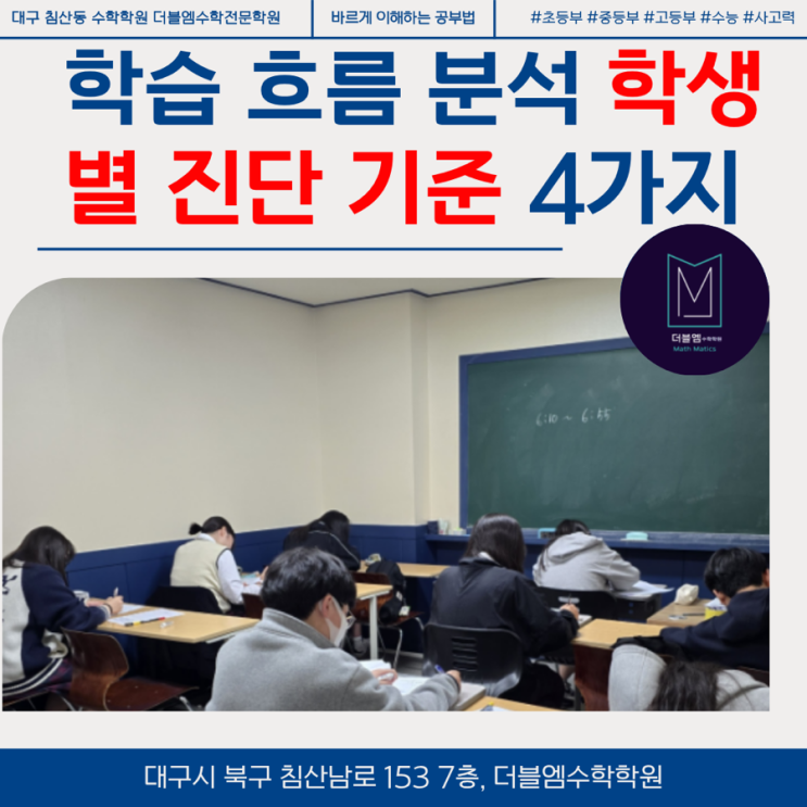 더블엠수학학원 ━ 대구 침산동 더블엠 수학학원 학생별 진단 기준 4가지 ㆍ대구 침산동 더블엠수학학원은 성적표보다 먼저 아이의 학습 흐름을 봅니다. 연산·개념·독해·풀이 과정 4가지 질문으로 아이의 현재 위치를 살피는 더블엠만의 철학을 소개합니다:) ㆍ 글. 사진 ⓒ mmmath01 안녕하세요. 대구 침산동더블엠 수학학원 입니다. 상담 전화를 받다 보면 학부모님들께서 가장 많이 하시는 말이있어요. “어디가 문제인지는 잘 모르겠는데, 수학이 자꾸 불안해요.” 문젲비은 꾸준히 풀고 있고, 학원도 다니고 있는데 시험 때만 되면 갑자기 불안해지고 분명 아는것 같은데 점수는 잘 안 나오고 아이도 왜 틀렸는지 모르겠어 라고 할때 답답하....... <img src="https://blogthumb.pstatic.net/MjAyNTEyMTFfMTMz/MDAxNzY1NDM5MTU2NTY5.XxzGJHc8eFeci25jMKzfpnL8Xn2E9MctYnku5P_2Lcgg.Y2K1AuYQDuC0d8OxkcFEs5RNF9CcpgVV7lAKx3_NKZ8g.PNG/%C1%A6%B8%F1%C0%BB%A3%DF%C0%D4%B7%C2%C7%D8%C1%D6%BC%BC%BF%E4..png?type=s3" />