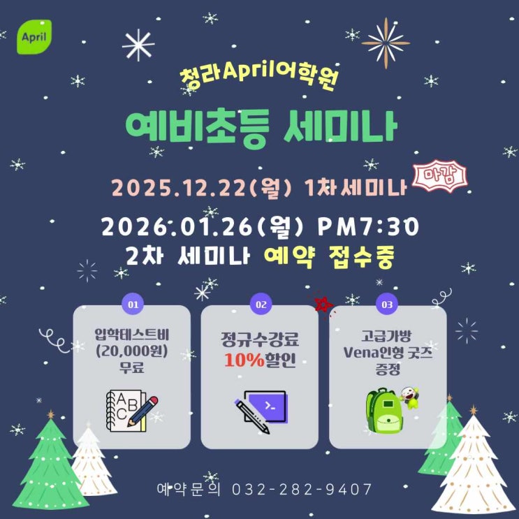안녕하세요 청라국제브랜치 청담April어학원입니다 ! 청라 April 예비초등 2차 세미나 를 안내드립니다. 초등 입학 전, 아이의 영어 첫 시작을 차분하게 준비해 보세요 1차 세미나 2025.12.22(월) ▶ 마감 2차 세미나 2026.01.26(월) PM 7:30 ▶ 현재 예약 접수 중 세미나 혜택 ✔ 입학테스트비 무료 ✔ 정규 수강료 10% 할인 ✔ 가방 & Vena 인형 증정 문의 032-282-9407 <img src="https://phinf.pstatic.net/image.nmv/blog_2025_12_12_2023/yM1Rf3fJAR_03.jpg?type=f480x480" />
