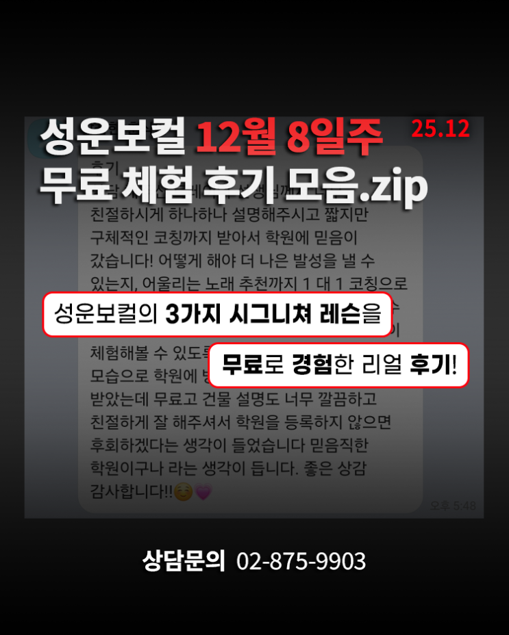 안녕하세요!! 여러분!! 모두 건강관리 잘 하고 계신가요? 오늘도 찾아왔습니다! 성운보컬의 뜨거운 체험프로그램! 25년 12월 8일주 후기를 들고 왔습니다 경험중심 음악교육을 추구하는! 성운보컬 입니다 !! 성운보컬의 체험프로그램이 시작되었는데요 !! 체험 프로그램 실제 후기! 12월 8일주 후기를 가지고 왔습니다 성운보컬의 3가지 시그니쳐 레슨 을 무료로 경험하고 체험해 볼 수 있는 기회!! 성운보컬 2024년 4월부터 기존 상담방식을 탈피하고, 여러분에게 다양한 교육의 경험을 제공 해드리기 위해 준비했습니다!! 아자!!!아자!! 전에 소개 해드렸던 저희 체험프로그램!! 12월 8일주 후기를 들고 왔습니다! ?....... <img src="https://blogthumb.pstatic.net/MjAyNTEyMTJfMjAy/MDAxNzY1NTIxMzE1OTAx.awy0i9z7_vSFjBPNJC8FnX7VQbrDRXV4R06UMyH8j8gg.-qgKXp3Fr919BiM3vPfj009dKhsO20kWf8muDzf8HAIg.PNG/%B0%A1.png?type=s3" />
