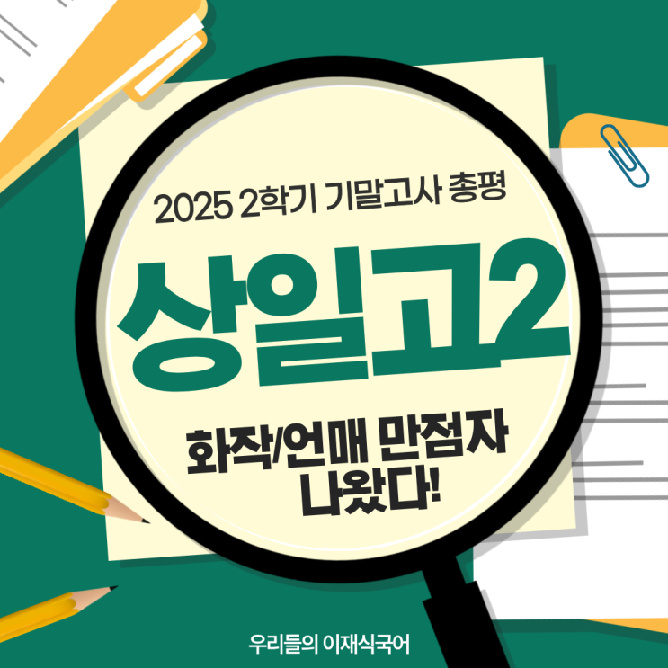 안녕하세요! 이재식국어학원입니다. 2학기 기말고사에서 상일고2 학생들이 멋진 성과를 보여 주었습니다. ^^ 무엇보다도 이번 시험에서 화법과 작문, 언어와 매체 두 과목 모두 ‘만점자’가 나왔다는 소식! 정말 대단해요~ 이번 기말고사는 두 과목 모두 시간이 빠듯했고, 변별력을 가르는 고난도 문항들이 곳곳에 배치되어 체감 난도가 쉽지만은 않았을 거예요. 그럼에도 불구하고 우리 학생들이 끝까지 집중해서 차분하게 문제를 풀어낸 결과, 값진 성과로 이어졌습니다. 학생들의 꾸준한 노력과 학습 태도가 있었기에 이재식국어의 내신대비 시스템이 더해져 이러한 결실을 만들 수 있었어요! 이제 본격적으로, 이번 시험 분석과 함께 다음 성....... <img src="https://blogthumb.pstatic.net/MjAyNTEyMTJfMTI1/MDAxNzY1NTQyODMwNDI5.fnlAQPGF2MtJi2YsKIYipF3zDM1kQ-LIMikUx9WIaw8g.y823UyVIzw5KjClb6VjVTlEDfY96xoL75ihI3ZRbXxgg.PNG/1.png?type=s3" />