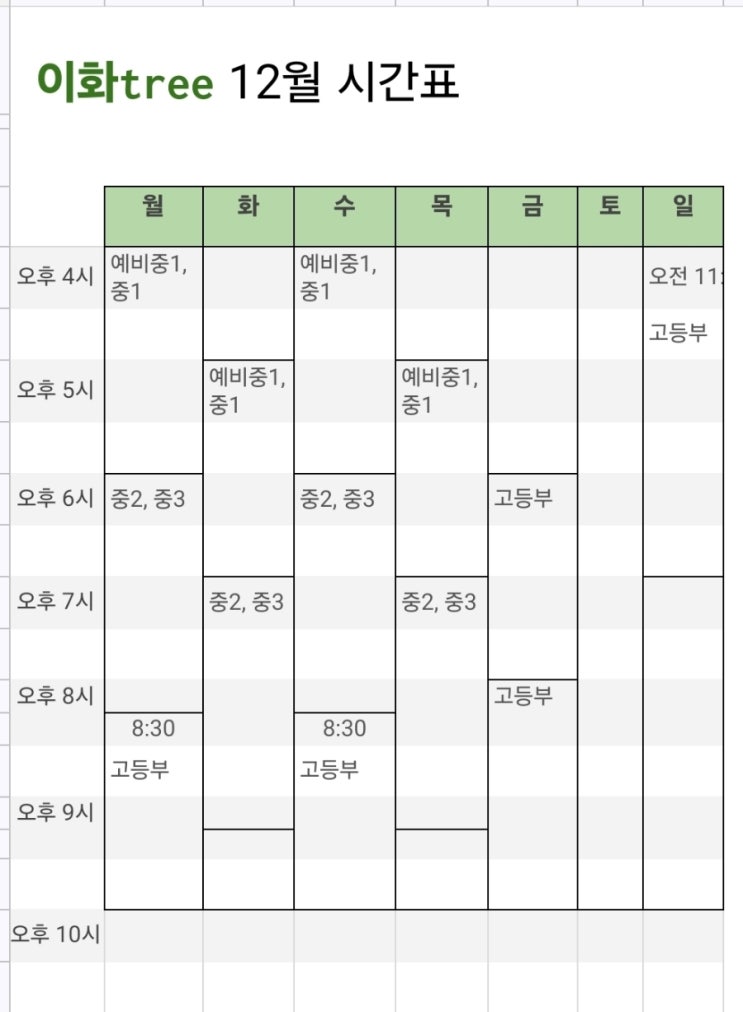 12월 시간표입니다. 12월은 중2~ 중3 시간표가 바뀝니다. 토요일 수업이 없고, 주 2회 2시간 30분씩 수업합니다. (수업료 인하) 2월까지 이렇게 진행할 예정입니다. 상담전화 010-8677-7923 문자로 학생의 학년과 상담 가능시간을 남겨주시면 전화드리겠습니다. 꼭 문자 먼저 보내주세요. 감사합니다~^^ (스팸전화가 너무 많아서 저장되지 않은 번호는 전화를 받지 않고 있습니다.) #내신대비#중등수학#고등수학#중학교수학#고등학교수학#수학#수학학원#수학교습소#수학공부방#수학과외#파주#교하수학#운정수학#다율동수학#청석마을#8단지수학#예비중1#예비중2#예비중3#예비고1#소수정원#소수정예#일대일#개별진도#교과#선행#기초#심화#동문디이....... <img src="https://blogthumb.pstatic.net/MjAyNTEyMDFfOTQg/MDAxNzY0NTg5MzYwNzM2.fhyN0sSAM7hZotuUqQz1ejvrggEPvGBZEFQ2TZQUVbIg.EF69_8SKMBAfBTD5K7TQL8Kc7SgAPhITIZcDwMPJ8_kg.JPEG/900%A3%DFScreenshot%A3%DF20251201%A3%DF203717%A3%DFSheets.jpg?type=s3" />