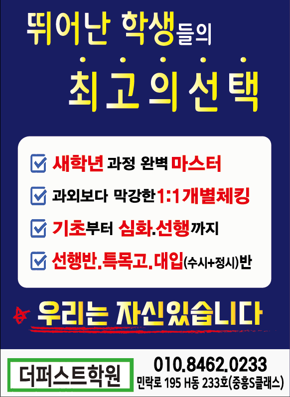 안녕하세요? 진심을 다하는 더퍼스트학원입니다. 이번 주에 중3시험이 마무리 됩니다. 고등 수학을 시작한 아이들도 있고 시작해야 할 아이들도 있습니다. 5등급제로 바뀌면서 기존 보다 난이도가 높아졌어요. 그래서 제대로 해야 됩니다. 어느 날 갑자기 유명해졌더라는 영국의 천재 시인 바이런에게 일어나는 일이기에 우리는 매순간 열심히 노력해야 됩니다. 순간 순간이 모여 미래의 나를 만들기에 시험 끝난 중3들은 이제 새로운 시작을 해야됩니다. 중학교때 보다 조금 더 많이, 그리고 깊이 그래야 다음 학년을 제대로 시작 할 수 있습니다. 반전을 꿈꾸는 중3학생들 외고 가고싶은 학생들 정시를 준비하는 고2 학생들 모집합니다. 외고 학....... <img src="https://blogthumb.pstatic.net/MjAyNTExMTlfMTIx/MDAxNzYzNTIzMTY1MTQw._8Fvt6qD6iPe6DWrzOymMVlD_tJDYbiYeWOfPeSBQBUg.OluiLu1d8Zvg5nGROYwWgnERRgnGL61C4_CGjExZJBgg.PNG/%A3%A5ED%A3%A599%A3%A594%A3%A5EB%A3%A5A9%A3%A5B4%A3%DF%A3%A5EC%A3%A5BA%A3%A5A1%A3%A5EC%A3%A5B2%A3%A598%A3%DF2020%A3%AD11%A3%AD19%A3%DF180407.png?type=s3" />