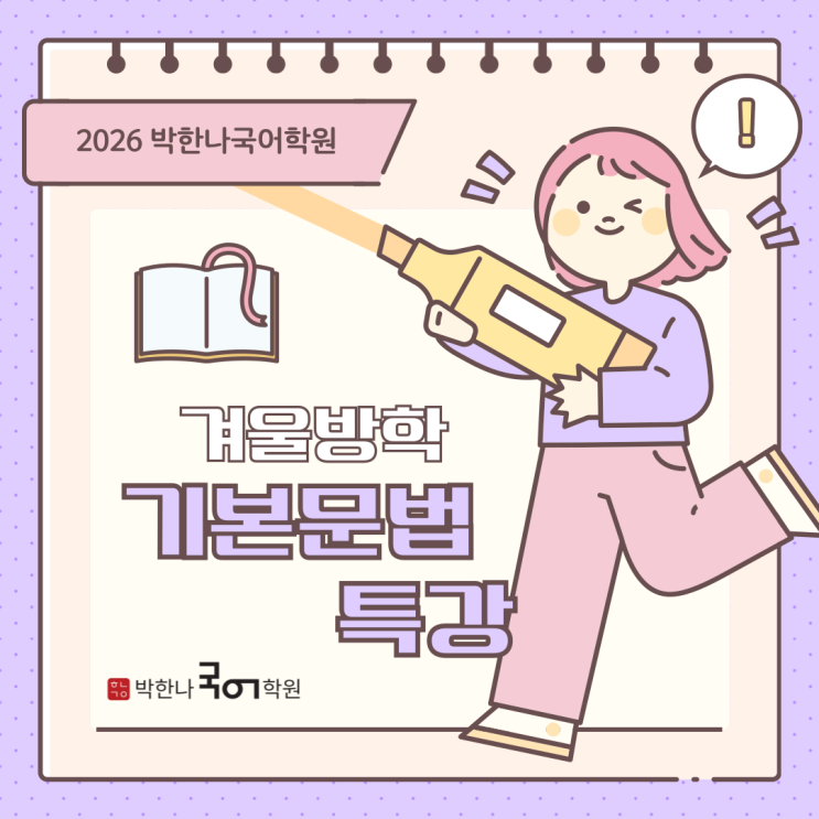 안녕하세요. 배움이 빛나는 박한나 국어학원입니다. 다가오는 2026 박한나국어의 겨울특강은 보다 더 다채롭습니다. 예비 중1 부터 시작해 예비 고1까지 영역별로 준비되어 있으니 학기 중 아쉬운 부분이 있었다면, 무엇을 보완해야 할 지 인지하고 영역별 올바른 습관을 기를 수 있길 바라는 마음입니다. 2026 박한나국어학원 빛나는 겨울방학 특강 안내 기본 문법 / 심화 문법 수능 모의고사 / 고전 문학 특강 우리 학생들의 학습 체력을 튼튼하게 만들어 갈, 어떤 특강이 준비되었을지 함께 살펴봅니다! **비재원생도 수강 가능합니다.** 수능 모의고사 / 고전문학 특강 링크 2026 박한나국어 겨울방학, 기본문법 5주 압축 완성 ■ 개강 일정....... <img src="https://blogthumb.pstatic.net/MjAyNTEyMTRfMjE1/MDAxNzY1Njk5OTE4ODgy.gQiRdSIbWzODsrdXrMctWrXfZyX7u3TntYDrVROj1Hwg.8b4WiCj8ZpHM42H-ueNtghyXNXKMXcegJ74VWMAKwTcg.PNG/%C1%A6%B8%F1%C0%BB-%C0%D4%B7%C2%C7%D8%C1%D6%BC%BC%BF%E4_-001_%2832%29.png?type=s3" />