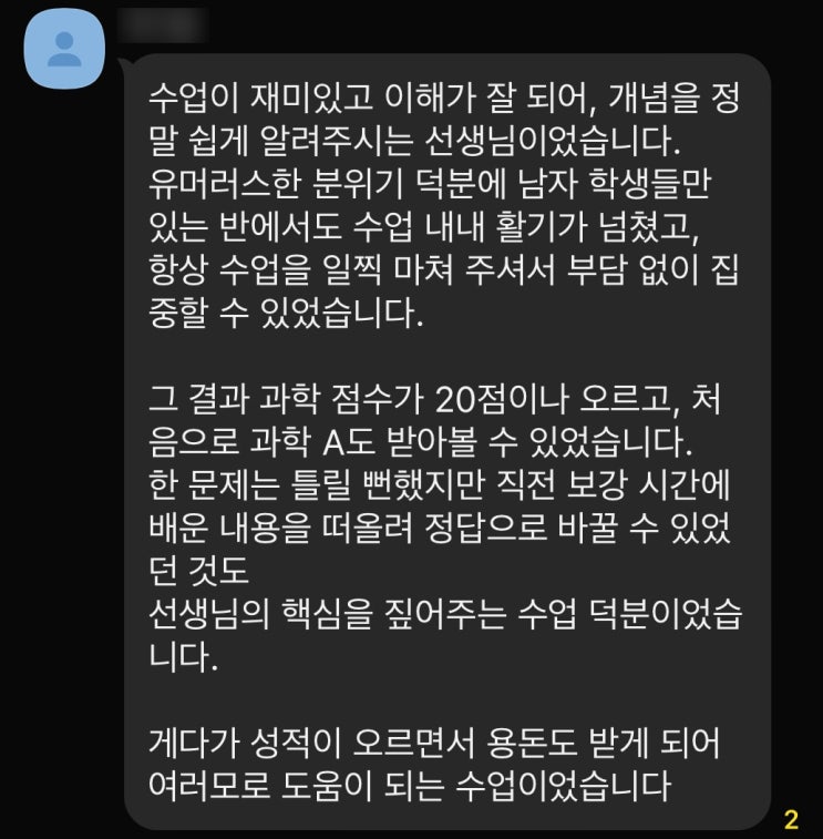 “과학 점수가 20점 올랐어요” 학생들이 직접 남긴 이승철 선생님 과학 수업 후기 과학이 어렵게만 느껴졌던 학생들이 “이해가 된다”, “점수가 오른다”고 말하게 된 이유는 무엇일까요? 아래 후기는 실제로 이승철 선생님의 과학 수업을 수강한 학생들이 남긴 카카오톡 메시지입니다. 학생들은 공통적으로 다음과 같은 점을 가장 큰 장점으로 꼽았습니다. ✔ 개념을 쉽게 설명해 주는 점 ✔ 핵심만 정확히 짚어주는 수업 방식 ✔ 부족한 부분을 끝까지 채워주는 꼼꼼함 이승철 선생님의 수업은 단순히 문제를 많이 푸는 방식이 아니라 개념 → 이해 → 적용으로 이어지는 흐름을 만들어 줍니다. 개념이 부족한 학생에게는 다시 한 번 짚어주....... <img src="https://blogthumb.pstatic.net/MjAyNTEyMTNfMjA5/MDAxNzY1NjA5ODU2MzE2.YG_MQbfX6SbDFrEwo2TpYOt4-Kg0e0E08hR7hOSULwog.2wmvphilTLDNoDD3GiLIp_j0Ox5SmE_dDETwMETOTr4g.JPEG/1765543570.847845IMG_1293.jpeg?type=s3" />