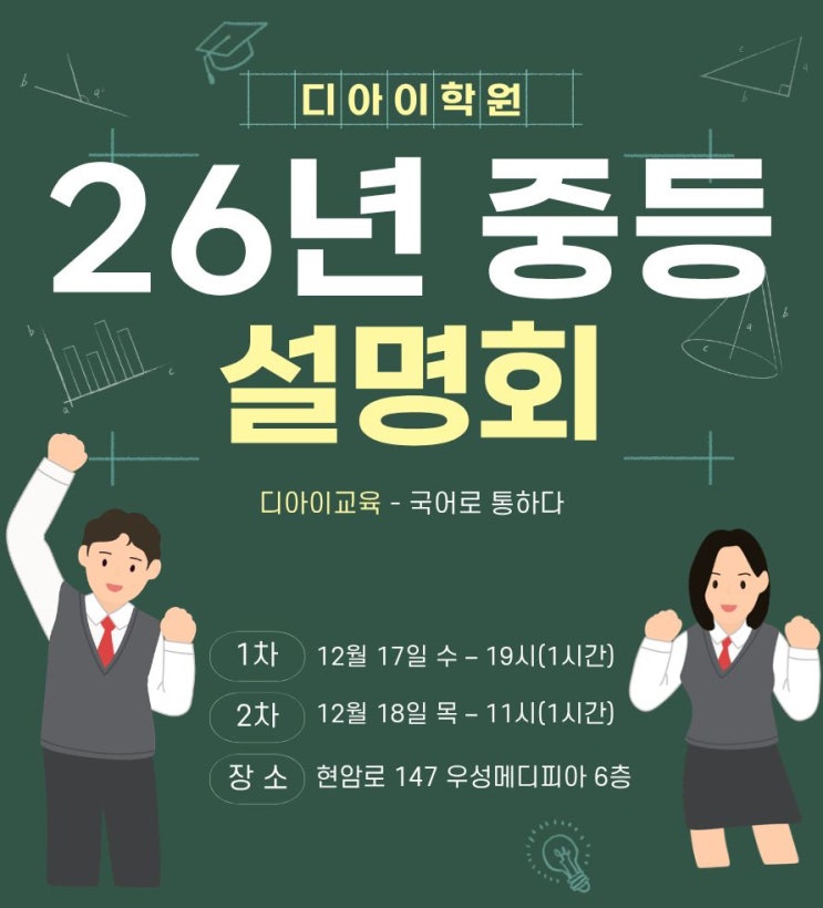 [디아이교육 - 국어로 통하다] 읽고 쓰고 이해하는 능력은 모든 공부의 기본입니다. 글을 구조적으로 읽고 정리하여 이해하는 능력은 정확한 분석 방법과 꾸준한 노력으로 이루어집니다. 무작정 읽기만 하고 문제만 푸는 국어학습이 아닌 독해의 원리를 이해하는 방식을 가르칩니다. <2026년 중등 국어 개강> 개강 : 1월 3일(토), 4일(일) 토 10시 - 1시 중3 토 1시 - 4시 중2 일 10시 - 12시 중1 주중 반은 원하시는 부모님께서는 학생 시간을 알려주시면 따로 반 편성을 도와드리겠습니다. <26년 중등 설명회> 1차 : 12월 17일 수 – 19시(1시간) 2차 : 12월 18일 목 – 11시(1시간) 2015 개정 교육 과정 고교학점제의 시행에 있어....... <img src="https://blogthumb.pstatic.net/MjAyNTEyMTFfMjAy/MDAxNzY1NDQ5MjQ2MDgw.PyTtGsizxeADiBfEJKXB8UvEvWit0_uvuZqjqqMCVnkg.qME0bSifh63FdhFPcyVVxGxdLpsAexQMcePiqjpSaAsg.JPEG/%C1%A6%B8%F1%C0%BB_%C0%D4%B7%C2%C7%D8%C1%D6%BC%BC%BF%E4.-2.jpg?type=s3" />