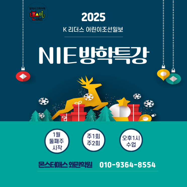왜관방학특강 NIE 특강 살아있는 교과서,신문 활용교육 합니다. 안녕하세요, 몬스터매스 왜관학원입니다. 겨울방학을 얼마남지 않은 지금 방학특강을 안내를 드립니다. 재원생 초등부 대상으로 NIE체험 수업을 진행한 다음 겨울방학 특강을 준비하게 되었습니다. 다양한 소재와 생생한 시사정보 및 사진을 담은 신문을 학습 교재로 활용해 읽기와 쓰기, 생각하는 과정을 통해 창의력과 표현력 비판적 사고력을 기르는데 도움이 됩니다. 1,2학년은 어휘, 독해 수업을 하면서 늘 독서에 대한 갈망이 있던중 브레인숲에듀에서 어린이 조선일보와 협업하여 K리더스 NIE 신문활용 교육이 있어 지도사 자격증을 준비했어요. 다독, 정독 등 다양한 의견....... <img src="https://blogthumb.pstatic.net/MjAyNTEyMTJfNDkg/MDAxNzY1NDk4ODg5NDI5.D4Luui7et-hNvQje53vpH4sG2jbFMpJJXNcVbGNSEGAg.R5kasrGeqkNUbin-6ZqwZajIjLgfVyQCVjOx7838RY4g.PNG/%C1%A6%B8%F1%C0%BB_%C0%D4%B7%C2%C7%D8%C1%D6%BC%BC%BF%E4._%284%29.png?type=s3" />