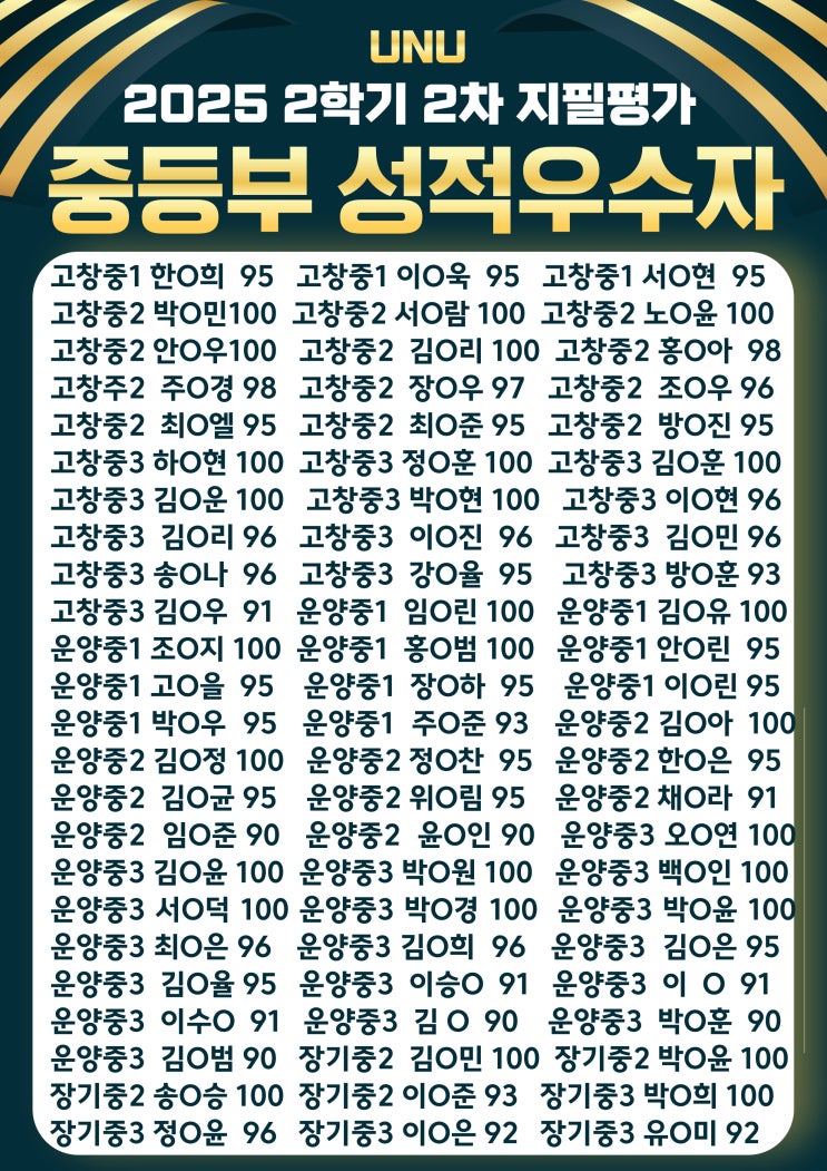 유앤유 영어전문학원 중등부(고창중, 운양중, 장기중, 푸른솔중)는 2025년 마지막 시험에서도 압도적 성과를 달성했습니다! (업데이트중!)
