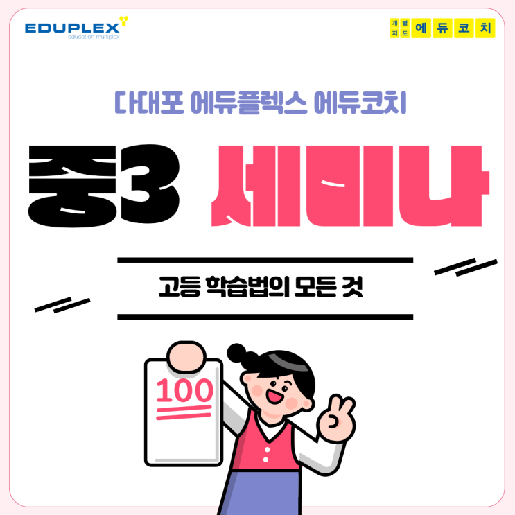 안녕하세요. 벌써 12월이 다가왔어요,, 올해도 얼마 안남았고, 내년이면 우리 중3 친구들이 진짜 고등학생이 된다구요!! 고등학교가서 공부할 생각에 두려운 우리 친구들을 위해서, 매니저님들이 준비한 학습법 세미나!! 맛있는 간식도 먹으면서 ~ 냠냠!! 열심히 집중하는 우리 친구들..ㅎㅎㅎ 워크시트 작성도 성실하게 잘 하고~ 오늘은 출석률이 좀 저조했지만... 세번의 세미나까지 모두 참석해준 친구들 칭찬해!! 고등 학습법도 잘 익혔으니 곧 다가올 겨울방학에는 윈터스쿨 프로그램으로 열심히 해보자구!! 화이팅이예요~~~~~ <img src="https://blogthumb.pstatic.net/MjAyNTExMjlfMTc0/MDAxNzY0NDEzODU4Mjk4.W6MA_NTGWMIXMHGtJqFLlZbSN2LP_9uV36UZUKLe3oQg.RjdhrqhnOQoOBIN_6nfvAZoQhGePJzIKno4Dpw5KFvEg.PNG/%C1%A6%B8%F1%C0%BB_%C0%D4%B7%C2%C7%D8%C1%D6%BC%BC%BF%E4..png?type=s3" />