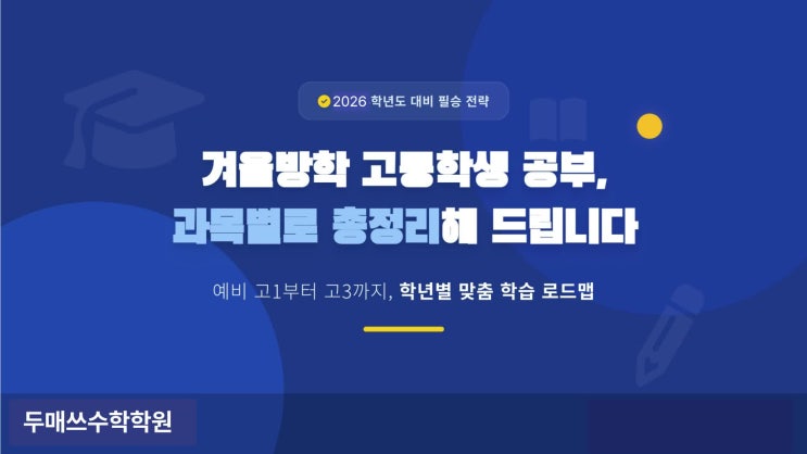 안녕하세요! 추운 겨울을 따끈하게 지낼 준비를 마친 두매쓰학원입니다. 항상 그래왔듯 두매쓰의 겨울 방학은 그 어느 때보다 바쁠예정입니다. 올해는 예비고1 들이 고등전문학원으로 옮겨가지 않고 남아 있기를 희망하는 학생들이 상당히 많은 관계로 오늘은 특별히 과목별로 겨울방학을 대비하는 전략을 공유하려고 합니다. 잘 보고 스스로에게 맞는 계획으로로 알찬 두 달을 지내길 바랍니다. #겨울방학 #옥빛초수학학원 #연푸른초수학학원 #옥빛중수학학원 #옥정중수학학원 #옥정수학학원 #옥빛중내신대비 #옥정중내신대비 <img src="https://phinf.pstatic.net/image.nmv/blog_2025_12_19_3001/VtRz7SKgnl_01.jpg?type=f480x480" />