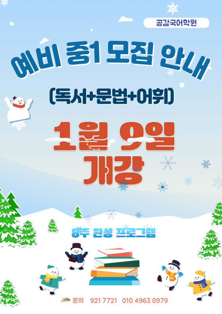 공감국어학원 예비 중1 수업 안내 독서 · 문법 · 어휘를 한 번에 준비하는 겨울 수업 초등에서 중등으로 넘어가는 시기, 국어에서 가장 크게 달라지는 것은 지문의 길이와 사고의 깊이입니다. 예비 중1 겨울은 ✔ 중학교 국어를 ‘미리’ 배우는 시간이 아니라 ✔ 중학교 국어를 버틸 수 있는 힘을 만드는 시기입니다. 공감국어학원에서는 예비 중1 학생들이 중학교 국어 수업과 평가에 자연스럽게 적응할 수 있도록 비문학 중심의 독서 + 문법 기초 + 어휘 정리를 한 번에 잡는 겨울 완성 프로그램을 운영합니다. 수업 구성 안내 예비 중1 비문학 수업 (독서 + 문법 + 어휘) 이번 예비 중1 수업은 ✔ 단순 문제 풀이 ✔ 선행 위주의 수업이....... <img src="https://blogthumb.pstatic.net/MjAyNTEyMTNfMjkz/MDAxNzY1NTkyODI0NDc3.S5dN_zNk-qYyM2Km7w4CYI5XoE5OJjWAvi8QlHPZwT8g.YyzLhXwMlQ9VRJWdJy2ZQbD2T90aYo9nIJzGIzzyE4Mg.PNG/KakaoTalk_20251213_095101927_01.png?type=s3" />