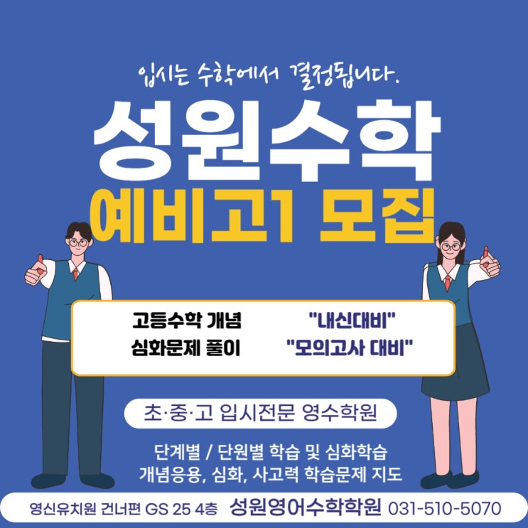 찬바람이 불기 시작하면 예비중1, 예비고1 학부모님들의 마음은 무거워집니다. "큰 학원에 보내야 정보가 많지 않을까?" "우리 아이가 진도를 못 따라가서 기만 죽는 건 아닐까?" 많은 아이들이 소위 '유명하다는'대형 학원에 등록합니다. 하지만 안타깝게도 그중 상당수는 칠판만 쳐다보다 오는 '들러리'가 됩니다. 강사가 자주 바뀌고, 질문 한번 제대로 못 하는 환경에서는 성적이 오를 수 없습니다. <성원영어수학학원은 다릅니다.> 1.강사가 아닌 '원장'이 직접 가르칩니다. 책임감의 무게가 다릅니다. 아르바이트 강사가 아닙니다. 원장인 제가 직접 아이들의 눈빛을 읽어가며 수....... <img src="https://blogthumb.pstatic.net/MjAyNTEyMDJfMjY1/MDAxNzY0NjUwMTM3Njc0.EzmvPgqU2geTtBl0juh2AkXj41iY2G4w1li4mNTW_6Qg.uvS-cTvop0uq0n-RbPJxSQXP-NbApbGBZJ4htlRuCx8g.JPEG/%BC%BA%BF%F8%BC%F6%C7%D0.jpg?type=s3" />