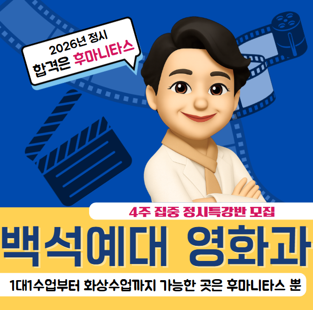 백석예술대학교 영화과 정시 대비 정리 스토리텔링 실기, 방향부터 다시 잡아야 할 시점입니다 안녕하세요. 표현, 그 너머를 바라보다. 후마니타스아카데미입니다. 오늘은 백석예대 영화과 정시 실기에 대한 포스팅을 가져왔습니다. 백석예술대학교 영화과 정시는 단순히 글을 잘 쓰는 학생을 선발하는 전형이 아닙니다. 주어진 조건 안에서 이야기를 구성하고, 그 이야기를 영화적으로 설계할 수 있는지를 확인하는 시험에 가깝습니다. 그래서 백석예대영화과를 목표로 준비하신다면, 작문 연습만으로는 부족한 경우가 많습니다. 특히 백석예대영화과정시는 실기 방식이 선택형으로 구성되어 있지만, 어떤 방식을 택하더라도 평가 기준은 분명합....... <img src="https://blogthumb.pstatic.net/MjAyNTEyMTlfMTg5/MDAxNzY2MTI2ODYxNDgy.IBZE5OtU6mLeVET0Cr92BbZ6yFeBxIyjreHSbuf1rtMg.T3AqCGxHLFKwnADH1qJ00o5hj1kVflCdK_KB5Os7Uz8g.PNG/image.png?type=s3" />