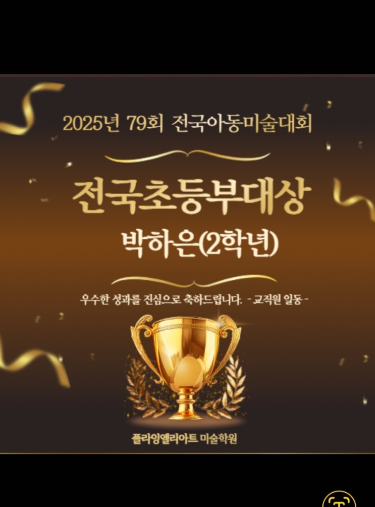 플라잉엘리아트 아이들이 제79회 전국학생미술대제전에서 다시 한 번 뛰어난 성적을 거뒀습니다. 전국초등부대상 을 수상했습니다. 유치부대상을 받았던 친구가 이번에 초등부대상을 받았습니다 수상을 축하합니다 매년 참가해오며 꾸준히 상위권을 기록해왔는데, 올해도 최우수상·우수상·금상·은상·동상까지 전 부문에서 고르게 수상하는 놀라운 성과를 보여주었습니다. 아이들이 한 작품에 몰입하며 표현력과 상상력을 마음껏 펼친 결과라 더 의미가 큽니다. 특히 플라잉엘리아트는 유치부부터 초등까지 단계별 미술 교육 시스템을 통해 아이들이 자연스럽게 실력을 쌓고, 스스로 그림을 즐길 수 있도록 돕고 있습니다. 이번 대회에서 보여준 성....... <img src="https://blogthumb.pstatic.net/MjAyNTEyMDNfMTQg/MDAxNzY0NzI1NDUzNzM4.tVSp2mfd8I0xj6L3Xhejhwnd95uUAj3U1yExw1d7iJ0g.jIM5sRsCYnGkmEm_WLTMlvfVa907xsoIEwQnBxOWc-Eg.JPEG/900%A3%DFScreenshot%A3%DF20251202%A3%DF161316%A3%DFGallery.jpg?type=s3" />