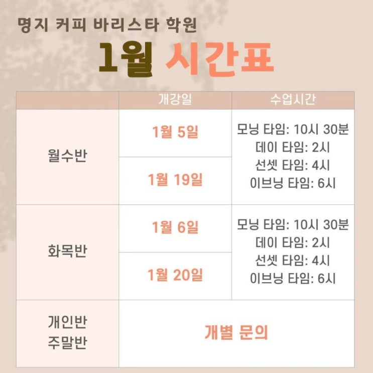 안녕하세요! 즐겁게 커피를 배우는 공간! 명지 커피바리스타학원입니다! 1월 자격증반 시간표 안내드립니다. • 개인수업은 상담을 통해 일정을 정합니다. 개인반, 주말반은 상시 모집중이며, 자세한 강의 내용은 학원으로 전화 또는 방문상담을 통해 친절히 설명드리겠습니다. • 소수인원(4인), 예약필수, 선착순 마감 • 실습위주 수업진행 정규반 일정 외에도 드립백 원데이 클래스와 핸드드립 원데이 클래스, 홈카페 등 다양한 수업이 있으니 언제든 상담 바랍니다. ● 오시는 길 ● ● 영업시간 ● 평일: 10:30 ~ 20:00 정기휴무: 매주 토,일 ● 전화번호 ● 051-207-1113 다른 사진들이 궁금하시다면 방문해주세요! 명지 커피 바리스타학....... <img src="https://blogthumb.pstatic.net/MjAyNTEyMTFfMjA4/MDAxNzY1NDY0MjQxNDk2.BNiWkB0CUIFDN9ZCgMUjvGYc6vFssny53PfkGpo3MJYg.ujGHdFqYAU8IbuA91SixHr_ECkCVkDcWqR3NTvsLiWog.JPEG/900%A3%DFmmexport1765464004170.jpg?type=s3" />