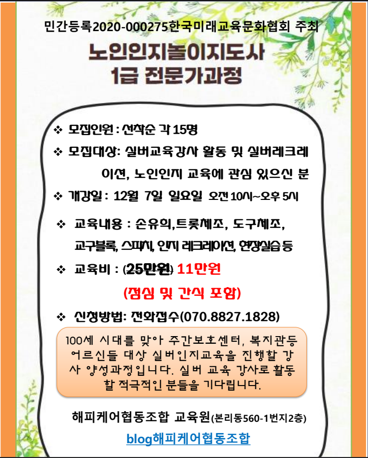 #노인인지놀이지도사과정 #할인교육과정#2회추가참여#현장실습# 동아리활동 #실버교육강사교육#강사파견#맞춤형실버교육#070 8827 1828 <img src="https://blogthumb.pstatic.net/MjAyNTExMTlfMTI4/MDAxNzYzNTM1NTUzODEy.hLR6z5yFAr4gRSrWwu7ZEDmK8AMl6PUbC_Mut2Hed-kg.kg3fsmVi06cwmgqYmrPSYzQEtoCbVn9yha_vDlmx-hYg.PNG/image.png?type=s3" />