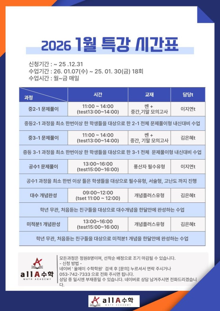 중등과정 2-1 , 3-1 문제풀이반 1학기 전과정 다 보는 문제풀이 반입니다 진도가 전체적으로 한번 이상 나간 친구들에게 적합한 반입니다 학년 무관합니다 대수, 미적분1 개념 완성 학년 무관하며 처음 듣는 친구들에게 적합한 반으로 오래전 선행으로 까먹었고나 처음부터 다시 듣고 싶은 학생들, 다시 꼼꼼하게 처음부터 듣고 싶은 학생들에게 추천합니다 공수1 문제풀이 공수1 과정 전범위 문제풀이 반으로 고등학교 내신이 걱정 되거나 혹은 공수1 문풀 과정을 듣고 싶은 학생들에게 적합한 수업 입니다 공수1 과정은 고등수학에서 워낙 중요한 부분이라 반복학습을 권장합니다 2월 특강은 전체 고등과정 특강이 됩니다 올킬 내신반은 1월 문....... <img src="https://blogthumb.pstatic.net/MjAyNTEyMDRfMTI0/MDAxNzY0ODI3MjY2NzQ3.VRy3lz212bA8kwG0mc0VstzEqKpZuDCB7SItEKBFbpIg.w4KdrZXEse8lWkl5thwJ3SNJeA5UHt8OE4gA-AWS3JUg.JPEG/IMG%A3%DF7830.JPG?type=s3" />