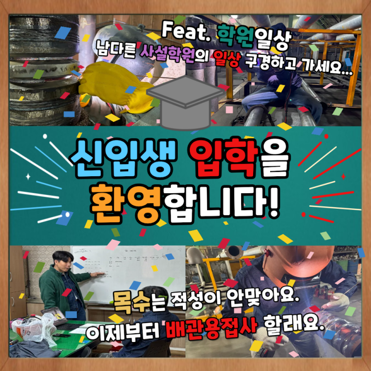 안녕하세요 용접강사겸 손선생배관용접학원장 손선생입니다. “배움은 끝이 아니라, 새로운 시작이다.” 손선생배관용접학원에 또 한 명의 새로운 식구가 함께하게 되어 이렇게 포스팅을 준비하게 되었는데요. 명언에서 처럼, 배움에는 경력도 나이도 실력도 중요하지 않습니다. 가장 중요한 것은 지금 이 순간, 자신의 가능성을 믿고 도전하기로 한 마음이죠. 오늘은 새롭게 들어온 신입생의 입학 이야기와 더불어, 학원의 소소한 일상도 함께 소개해보려고 합니다. 그럼 바로 시작해볼까요? "입학을 환영합니다." 손선생배관용접학원에 새로운 식구가 왔습니다. 다소 긴장한듯한 모습이 영락없는 순도 100%초보의 뒷모습이죠? 오늘 소....... <img src="https://blogthumb.pstatic.net/MjAyNTEyMDFfMjg2/MDAxNzY0NTkyMzU3MzIx.FxR8G7x63VNDdbqHsTzyLgQrTpyVpUoAw_I3dtcNs4gg.Vd3SA13Nn-uCIfmMVAjDGqFyaZi0Q4Z7KXjvMFqtkFUg.PNG/%3F%A0%9C%EB%AA%A9%EC%9D%84_%3F%9E%85%3F%A0%A5%3F%95%B4%EC%A3%BC%EC%84%B8%3F%9A%94._%2817%29.png?type=s3" />