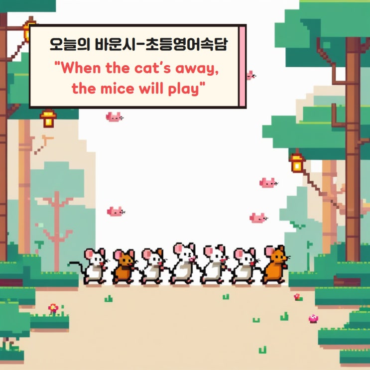 안녕하세요! 청담 에이프릴에서 만든 온라인영어 BOUNCY 입니다. 학교에서 선생님이 잠깐 교실을 비우면 갑자기 시끌벅적해지던 경험, 기억나시나요? 회사에서도 상사가 회의하러 나가면, 직원들이 살짝 느슨해지는 순간들 있죠? 이럴 때 딱 어울리는 영어 속담이 있어요! "When the cat’s away, the mice will play." 직역하면 “고양이가 없을 때, 쥐들이 논다” 라는 뜻이에요. 비유적으로는 감시하는 사람이 없으면 사람들은 규칙 없이 자유롭게 논다는 의미랍니다. 예문을 통해 더 알아볼까요? 예문1 A: The teacher left the classroom, and the kids started talking loudly. (선생님이 교실을 나가자 아이들이 갑자기 떠들기....... <img src="https://blogthumb.pstatic.net/MjAyNTA4MTJfMjI3/MDAxNzU0OTc4NjUyODI3.5Czp7N_g9q1ReeOWtocOdyg4JZ0goEYjJfkRyk2IcXwg.HyUcJBNqP81WjzArtIW7TG8Wr_Z_VLGBec1c596Y0ZAg.JPEG/%C1%A6%B8%F1%C0%BB_%C0%D4%B7%C2%C7%CF%BC%BC%BF%E4_%283%29.jpg?type=s3" />