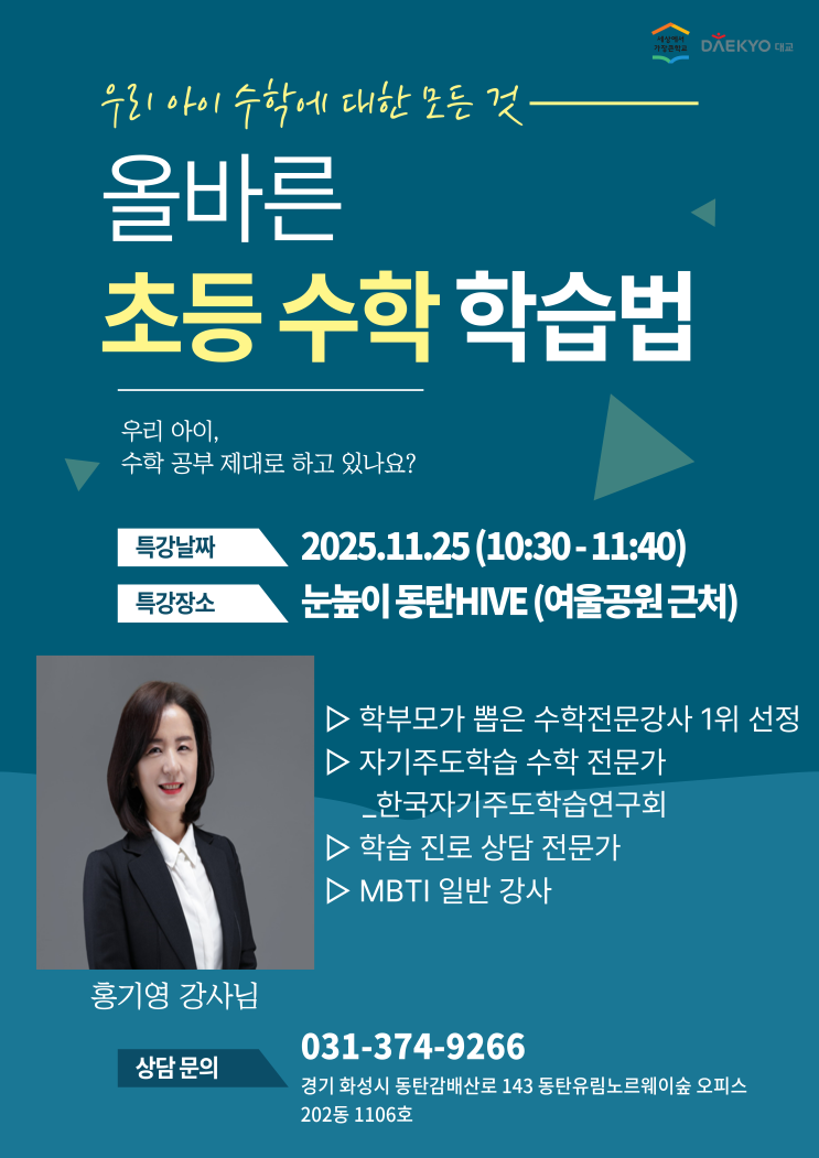 안녕하세요!! 대교 눈높이러닝센터 푸른학원 블로그입니다~ 요즘 일교차가 큰 날씨에 하루가 참 빠르게 지나가네요. 아이들 학교생활 챙기시느라 바쁘실 텐데, 모두 건강하게 보내고 계신가요? 오늘은 학부모님들을 위한 특강 하나를 소개해드리려 합니다. 초등 수학 학습, 방향을 잡고 싶다면? 수학은 초등 시기부터의 학습 습관과 사고 구조가 앞으로의 실력을 결정합니다. 이번 강좌에서는 수학 전문 강사가 초등 시기에 꼭 알아야 할 학습 방향과 올바른 공부 흐름을 쉽고 명확하게 안내드립니다. 강좌 소개 초등 수학에 맞는 학습 전략, 개념을 잡는 방법, 집에서의 피드백 방향까지!! 학부모님들이 가장 궁금해하는 ‘정말 필....... <img src="https://blogthumb.pstatic.net/MjAyNTExMjFfODAg/MDAxNzYzNjkzMjIzMjk3.0XAL_NP5YvlZnSyN7RyaZQPLf8syl9Asc4-Av-HwgI4g.NjU_jjVElSXIdu3Y6tsbuEM_FwJeOm0OEMNzySt_M58g.PNG/KakaoTalk_20251105_175507822.png?type=s3" />