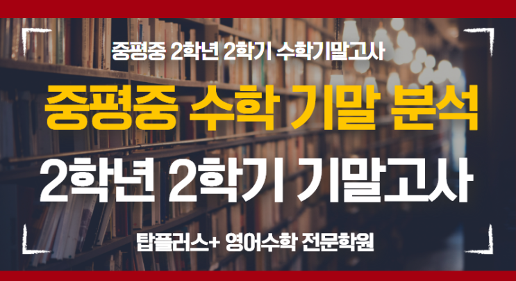 안녕하세요~^^ 중평중영어/중평중수학학원 탑플러스+ 영어수학 전문학원입니다. 오늘 포스팅은 중평중 2학년 2학기 지필평가 수학 시험 분석입니다~^^ ▣ 시험 난이도 및 분석 ●이번 중평중 2학기 기말고사 난이도는 어려웠다고 생각합니다. ●학생들의 오답률이 높거나 어려워했을 유형으로는 6문제로 예상됩니다. ●6번 문항은 평면도형의 넓이의 비 문제입니다. 이 문제는 난이도가 높은 문제는 아니었지만 오답률이 높았을 거라 생각되는 문제입니다. 주어진 조건의 설명이 긴 편이라 읽는 과정에서 순간적으로 집중력을 잃으면 어렵게 느꼈을 수도 있었습니다. 문제에서 주어진 길이 비를 찾은 다음, 넓이 비를 이용하여 구해야 합니다. 학....... <img src="https://blogthumb.pstatic.net/MjAyNTEyMTFfMjY5/MDAxNzY1NDM4ODQxMjky.I30qnl7fZa-_YKKx_vmQo-sqV3ipNc5ebLtEa8smWaIg.OZ3Ax10OKhx2pPKMPYwRK8WAK7ON9TOoGtNyD6y_u3gg.PNG/%C1%DF%C6%F2%C1%DF%BF%B5%BE%EE%C7%D0%BF%F8_%C1%DF%C6%F2%C1%DF%BC%F6%C7%D0%C7%D0%BF%F8_%C5%BE%C7%C3%B7%AF%BD%BA%C7%D0%BF%F8_%BC%F6%C7%D0%B1%E2%B8%BB%BA%D0%BC%AE.png?type=s3" />