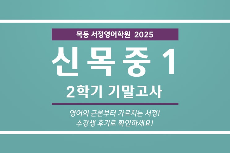신목중 1학년 재원생 여러분, 중학교에 올라와 처음 치르는 시험이었음에도 모두 열심히 준비해 좋은 결과를 보여주어 정말 수고 많았습니다. 이번 시험은 중등 영어의 시작을 확인하는 첫 평가였던 만큼, 앞으로 어떤 부분을 보완하면 좋을지 점검하는 데도 큰 의미가 있었어요. 그럼 이제 어떤 유형이 출제되었고, 어떤 문법이 고득점을 결정했는지 시험 내용을 함께 분석해 볼까요? ① 시험 범위 출판사: 동아윤 범위: 교과서 4~7과(listen& speak 제외) + 해당 범위 학습지전체 ② 출제 유형 선택형 (총 30문항) 2점 × 2문항 = 4점 3점 × 16문항 = 48점 4점 × 12문항 = 48점 ③ 총평 이번 신목중 1학년 2학기 기말고사는....... <img src="https://blogthumb.pstatic.net/MjAyNTEyMTBfMjg5/MDAxNzY1MzU4NzAzMzE2.KS_urkhAWOq35kmQ-0zEXOYyUvsuiQHTJe-z1_tyl74g.lpwJCJvjBhaWZRO0pL-37Mw0MLq88Da9OTGJ2vL1-Aog.JPEG/25%BD%C5%B8%F11_2%C7%D0%B1%E2_%B1%E2%B8%BB_%BA%B9%BB%E7.jpg?type=s3" />