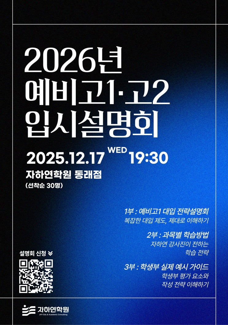 2026학년도 예비고1 입시설명회 안내 안녕하세요, 자하연 학원입니다. 이제 곧 고등학교 입학을 앞둔 예비고1 여러분과 학부모님을 위한 입시설명회를 준비했습니다! 고등학교 생활, 공부 방향, 바뀐 입시 흐름과 함께 고등학교 입학 전 알아야 할 입시 핵심 전략까지 준비했습니다. 많은 관심과 참여 부탁드립니다! 일시 : 2025년 12월 17일 (수) 19:30 장소 : 동래 자하연학원 7층 대상 : 예비고1, 2 학생 및 학부모 인원 : 선착순 30명 신청방법 : 아래 구글폼 작성 후 제출 https://docs.google.com/forms/d/e/1FAIpQLSdXCw3hpsH5EoocSS0nQs6iD58ZjBz6xoH6_eMoCDbKrFSEUg/viewform 자세한 상담은 자하연학원 051)92....... <img src="https://blogthumb.pstatic.net/MjAyNTEyMTJfMTQ5/MDAxNzY1NTI1ODE2MDA3.9Geu4abENMpubMARgiApUaO_97oqyHAUl6PZ3T7wpdIg.hx43U6AbmDbH-UFgyQKDkJmsAZFa_39IAIBubtiJyugg.JPEG/%C1%A6%B8%F1%C0%BB_%C0%D4%B7%C2%C7%D8%C1%D6%BC%BC%BF%E4.jpg?type=s3" />
