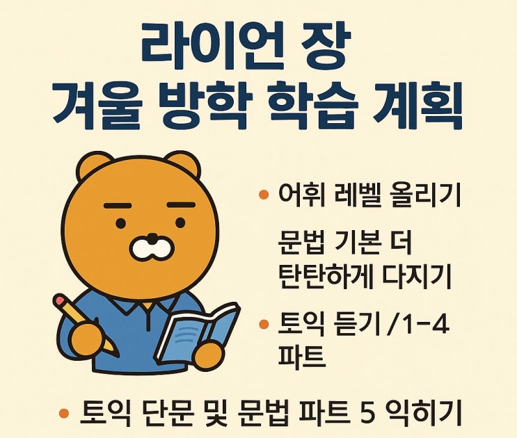 학년 별 / 수준별 매일 20 ~ 200 단어 암기 - 매일 쓰기 숙제 및 매일 시험 - 문장을 이용한 단어 쓰기 정리 - 철저한 오답 정리 문법 기본기 더욱 탄탄하게 다지기 - 주2회 문법 시험 - 내용 습득 및 오답 정리 방학 동안 토익을 이용한 듣기 / 어휘 / 문법 수업 토익 파트 1~5 응용하여 문제 풀이 및 연습 12월 3째 주부터 바로 시작합니다!! #라이언장 #라이언장영어 #라이언장영어전문학원 #전주영어학원 #전주토익 #토익만점 #토익기초 #토익듣기 #영어방학특강 <img src="https://blogthumb.pstatic.net/MjAyNTEyMDlfMjky/MDAxNzY1MjY5NzE3OTk3.KAyVdR984ccQa53yfOUhOki03P9NXJM21YCFMdYV6kgg.WYqs6entgJdvVx6npN35ihKlqdWUkNvYJURA7guSKpQg.JPEG/%B0%DC%BF%EF%B9%E6%C7%D0_%B0%E8%C8%B9.jpg?type=s3" />