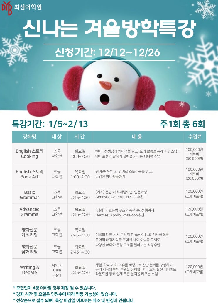 최선어학원에서는 겨울방학을 더욱 알차게 보내고 영어실력을 향향상시킬 수 있도록 겨울방학 특강을 진행합니다. 수강 신청 방법 구글링크 https://forms.gle/za6crmTdCrXRWPG28 2. 최선어학원 경기광주캠퍼스 ☎ 031-767-1666 선착순 마감!! 방학을 알차게 보내고 싶은 학생이라면, 지금바로 신청하세요! <img src="https://blogthumb.pstatic.net/MjAyNTEyMTJfMTA3/MDAxNzY1NDgxOTMzNjI4.xG-8_qYG5Rgj-6nUzTMJRnaYG2RhLVQ95x2XrFbNZ1Eg._gLXrG1Y3hSmXG3j2CFeJx2u2s_VoLwIdTltKTPo_cIg.JPEG/2026%B0%DC%BF%EF%C6%AF%B0%AD.jpg?type=s3" />