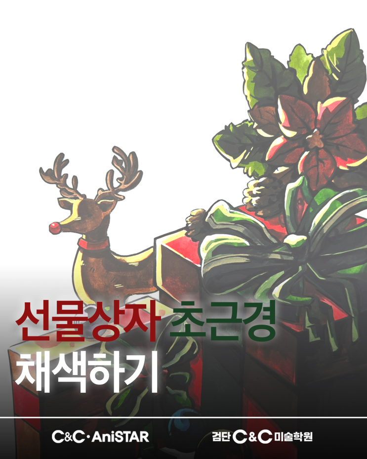 안녕하세요~ 인천서구 검단C&C미술학원 애니관 애니스타입니다! 오늘은 선물상자 초근경 채색을 알려드리려고 합니다. 어떻게 채색하는지 차근차근 설명해 드릴게요~ STEP.1 초근경은 상황을 '부가 설명'해 주는 프레임입니다. '선물'과 어울리는 상자와 장식들을 그려줍니다. STEP.2 빨강, 초록을 메인 컬러로 사용해 기본색을 칠해줍니다. Tip. 뒷면은 어둠으로 눌러줄 예정이니 굳이 색을 칠하지 않아도 됩니다. STEP.3 1차 명암에서는 개체의 큰 덩어리를 잡아줍니다. 주제부를 명확하게 보여주기 위해서 초근경의 명도를 확실하게 잡아주는게 포인트!! STEP.4 빛이 닿지 않은 부분의 어둠을 확실하게 잡고....... <img src="https://blogthumb.pstatic.net/MjAyNTEyMTBfMjkx/MDAxNzY1MzY3NDQ0NjM4.It4rzssxyw4lbFFj-eEgvQiyKnefNeiqOIWm8O-eDGwg.6BkwBjLNAXLbiTqftqdTfJrINmQKmMuyebfG_vC9x8Eg.PNG/KakaoTalk_20251114_152439215.png?type=s3" />