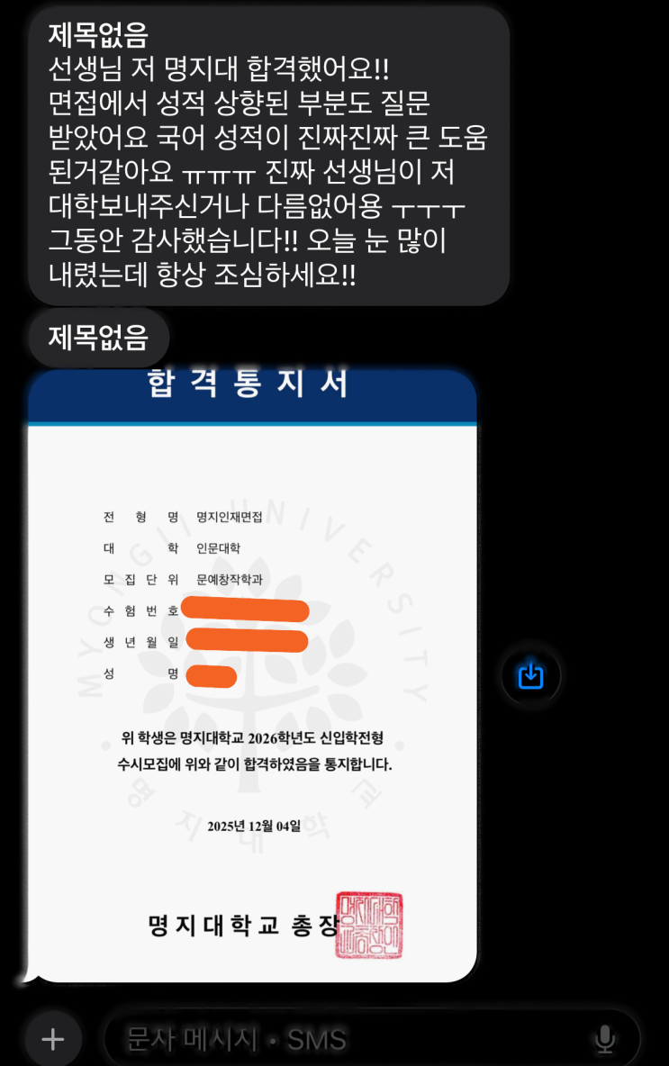 며칠 전에 카톡으로 문자가 왔다. 대학에 합격했다고~ ○○이는 고양예고 문창과를 다니고 있고, 대학도 문창과를 지망한 학생이다. 2년 전 처음 만났을때는 1학년 여름방학 무렵이고, 1학년 1학기 내신이 6등급이어서 열심히 해야하는 학생이었다. 고양예고의 경우 방과후수업이 많아서 거의 모든 학생이 주중에는 저녁 9시까지 학교에서 방과후수업을 한다. 과제를 할 시간도 없고, 학원에 한 번 더 와서 클리닉을 할 시간도 없다. 주말수업에 집중했고, 내신 대비에 집중했다. 난 시험대비 수업에서 학생에게 문제를 많이 주는 것을 좋아하지 않는다. 내용 이해는 같이 하지만, 문제풀이의 대부분은 학생이 해내야 한다. 지나치게 많은 문제는....... <img src="https://blogthumb.pstatic.net/MjAyNTEyMTFfMTEw/MDAxNzY1NDYyMjE1OTcy.ktXOnd3-ibYsdHokEysU1k9oVtuiIVQVBWVzsicDpJsg.yWr4AJZE7HhEDAtWNBUMVyxWppT7CFaLWYmRa2dTR5Mg.PNG/%B8%ED%C1%F6%B4%EB%C7%D5%B0%DD%BC%D2%BD%C4_-_%C0%CC%B8%A7%C1%F6%C0%BD.png?type=s3" />