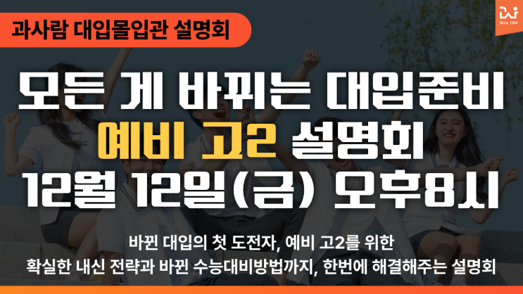 [과사람 사하대입몰입관] 바뀐 대입과정 첫 도전자 예비 고2를 위한 설명회가 12월 12일(금) 오후 8시에 진행됩니다