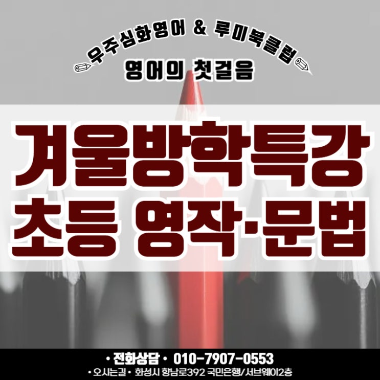 우주심화영어 겨울방학 초등 영작·문법 특강 커리큘럼 안내 – 향남 초등 영어학원 우주심화영어 – 겨울방학 동안 우리 아이 영어 실력을 한 단계 깊게 만들고 싶다면, 우주심화영어의 겨울방학 초등 영작·문법 특강을 꼭 확인해 보세요. 이번 프로그램은 기초 문장 구조부터 문단 쓰기까지 차근차근 완성할 수 있도록 구성된 실전 중심 커리큘럼입니다. 특히 향남 초등 영어학원 중에서도 체계적인 영작 지도로 유명한 우주심화영어만의 노하우가 그대로 담겨 있어, 영작이 낯선 학생부터 자신 있게 문장을 쓸 수 있도록 도와줍니다. 우주심화 프로젝트1 -자신 소개하기 프로젝트 첫 번째 프로젝트는 아이들이 가장 많이 쓰는 자기소개 영작을....... <img src="https://blogthumb.pstatic.net/MjAyNTEyMTFfMjIy/MDAxNzY1NDU4MDUyODEx.1VNP-iSzS8rDWoWT72izW9HG_8-D53NPowWOXsbVvz8g.XAk4FNa9sEXmaoXuRpV2Om9dr8kqeNblnSjff0jxqIkg.JPEG/001.jpg?type=s3" />