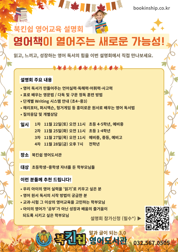 영어책이 열어주는 새로운 가능성! 읽고, 느끼고, 성장하는 영어 독서의 힘을 이번 청라 북킨쉽 설명회에서 직접 만나보세요 영어 원서 읽기가 아이의 영어 실력을 바꾸는 이유 — 북킨쉽 영어교육 설명회 안내 — 아이의 영어 공부, 어떻게 시작해야 할지 고민되시나요? 요즘 많은 학부모님들께서 문법·문제풀이 중심의 학습만으로는 한계가 있다고 느끼고 계십니다. 특히 중학교, 고등학교로 올라갈수록 “읽기 실력”의 차이가 성적을 좌우한다는 사실은 이미 잘 알려져 있습니다. 그래서 최근 많은 부모님들이 다시 주목하고 계신 학습 방법이 바로 영어 원서 읽기 입니다. 원서를 읽는 과정 속에서 자연스럽게 어휘력·독해력·문법 감각....... <img src="https://blogthumb.pstatic.net/MjAyNTExMTdfNDcg/MDAxNzYzMzY0MDg1OTA3.HQ1ZKWSWeOY8UgbgGgKaPZS9TQ8aBXLIJ0C6bBgY69Ig.tlnrYEF_bN2OAMeuFsioGhZLQdyAsNrWKfmJ-rXdhYkg.PNG/25%BF%B5%BE%EE%B1%B3%C0%B0%BC%B3%B8%ED%C8%B8.png?type=s3" />
