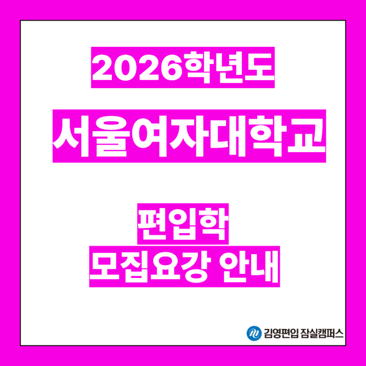 안녕하세요. 편입합격의 모든 것!! 강남 서초 송파 잠실 구리 남양주 양주 중랑 광진 강동 김영편입 잠실캠퍼스입니다. 인서울 여대 중 하나인 서울여자대학교에서 2026학년도 편입모집요강을 발표했는데요. 하나씩 알아보겠습니다. 1. 모집단위 및 모집인원 2026학년도 서울여자대학교 편입학 시험은 글로벌ICT인문융합학부 메타버스융합콘텐츠전공 등 284명을 정원 내에서 모집하고, 농어촌학생, 특성화고교졸업자, 재외국민 특별전형으로 51명을 정원 외로 모집합니다. 2. 전형일정 서울여자대학교 2026학년도 편입학 시험의 인터넷 원서 접수는 2025년 12월 19일(금) 10시부터 2025년 12월 23일(화) 17시까지 진행합니다. 서류 제출은 2025년....... <img src="https://blogthumb.pstatic.net/MjAyNTEyMTJfMTQ4/MDAxNzY1NTE0NTE1NTM3.a-FhfDKBC4LM80sppyyhpEvqCYoseCtsaAS6WeG-qGkg.U5OU3bxY-QiZXEa1d09AVQt-MKlbBBk3tGLRgzv5L1Ag.PNG/20251212_%BC%AD%BF%EF%BF%A9%B4%EB.png?type=s3" />