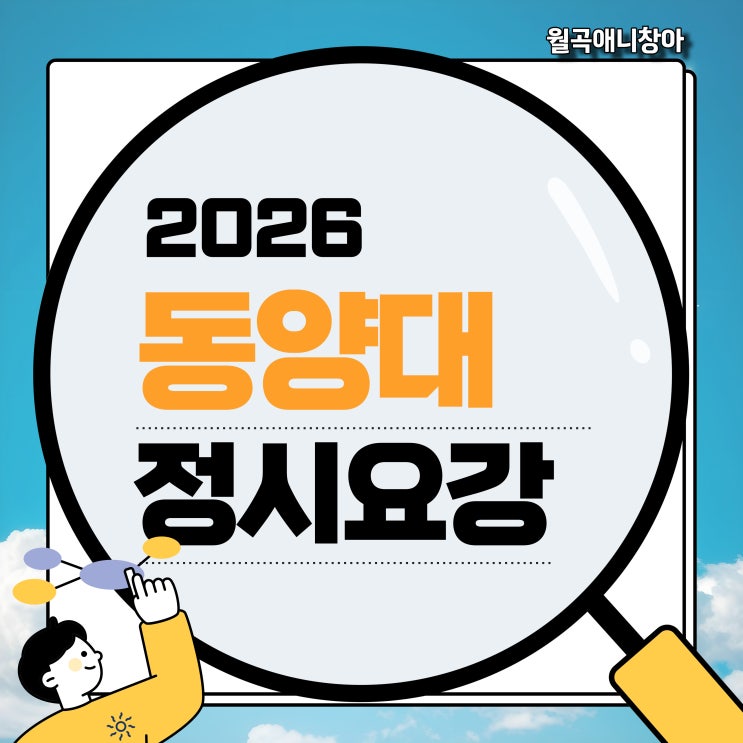 안녕하세요, 월곡애니창아입니다 :) 2026학년도 동양대학교 웹툰애니메이션학과 정시모집 요강이 공개되어 전형일정부터 실기 유형, 수능 반영방법까지 핵심 내용을 정리해드립니다. 전형일정 원서접수 : 12월 29일 ~ 12월 31일 실기고사 : 1월 26일 합격자 발표 : 1월 29일 동양대는 실기일이 1월 말로 비교적 늦어 방학 동안 충분한 연습 시간을 확보할 수 있다는 점이 장점입니다. 모집인원 웹툰애니메이션학과 : 5명 모집인원이 많지 않아 실기에서 자신의 강점을 확실하게 보여주는 것이 중요합니다. 반영비율 수능 30% + 실기 70% 실기고사 안내 실기 유형은 아래 세 가지 중 택1입니다. 칸만화 상황표현 이미지보드 시험 시간은 4절 / 4시....... <img src="https://blogthumb.pstatic.net/MjAyNTEyMTJfMTUw/MDAxNzY1NDY2NDQ4NzM3.yytRXD5UXXtjRWFsD8KtE-BXmZ5OiZ3cw08EDP8fkm8g.fywuqIGhBrGSo8StwshKgNLYf_7DbW0RRT9jDnWn2KMg.JPEG/001.jpg?type=s3" />