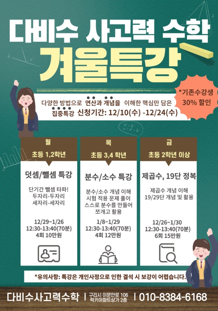 다비수 사고력수학을 통한 연산과 분수 소수 제곱수와 19단을 통한 계산확장과 자신감을 올릴수 있는 겨울 특강을 준비합니다 이번겨울 특강이 우리 아이에 수학 실력향상과 자신감'상승이 될 기회입니다 #다비수#다수학고력수학#다비수연산#유아수학#초등수학#초등사고력수학#초등교과수학#구리부양초등학교 #구리백문초등학교#구리토평초등학교#장스소아과 #구리럭키아파트#구리교문초등학교#장자초등학교 #구리장스병원#유아놀이수학#구리유치원 #오션키즈구리#수택동수학학원#수학교습소#키즈수학 #장자초등학교구리#구리럭키아파트수학 <img src="https://blogthumb.pstatic.net/MjAyNTEyMTBfMjkz/MDAxNzY1MzI2MDYxNzc1.8N78p0GEobjrtLI6Jx7ccYC-UEbP_p33afQAke9-XGog.oMDfANBH1862aTsRsyhoCRMRojNKAtRhyE2pCTduLNog.JPEG/900%A3%DF1765289116507.jpg?type=s3" />