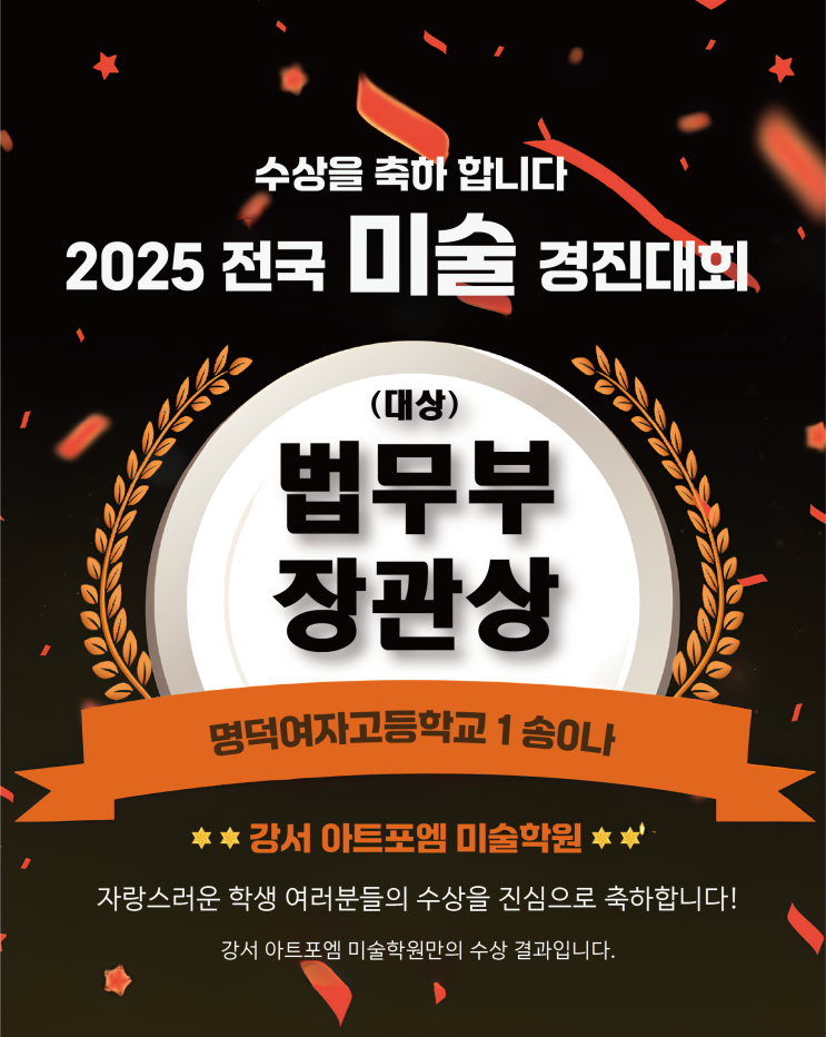 강서구미술학원 아트포엠 | 전국 미술 경진대회 법무부장관상(대상) 수상 안녕하세요. 강서 아트포엠 미술학원입니다. 학원을 선택할 때 가장 많이 듣는 말이 있습니다. “잘 가르친다”, “피드백이 꼼꼼하다”, “실력이 는다.” 하지만 학부모님과 학생들이 진짜로 궁금한 건 결국 하나입니다. 그래서, 결과가나왔나요? 저희는 그 질문에 말로 답하지 않겠습니다. 전국 학생 미술 경진대회 ‘대상’으로 증명하겠습니다. 최근 전국 규모로 진행된 미술 경진대회에서 아트포엠 고1 학생이 법무부장관상(대상)을 수상했습니다. 단순히 상을 받았다는 소식이 아니라, 수업에서 반복해온 주제 해석–구성 설계–표현 완성–피드백 반영의 과정이 실....... <img src="https://blogthumb.pstatic.net/MjAyNTEyMTVfMjQg/MDAxNzY1NzI0NzU2ODYw.s7byZ5C3eF68-Jgr5yLdJCio1CDpFrijqBhVVATfn30g.DY9d3WtJyAFAtpplQY7q-pyYojQ8ZBHrKrbvmX4qvM0g.PNG/%B0%E6%C1%F8%B4%EB%C8%B8_%B4%EB%BB%F3_%C0%CC%B9%CC%C1%F6_%281%29.png?type=s3" />