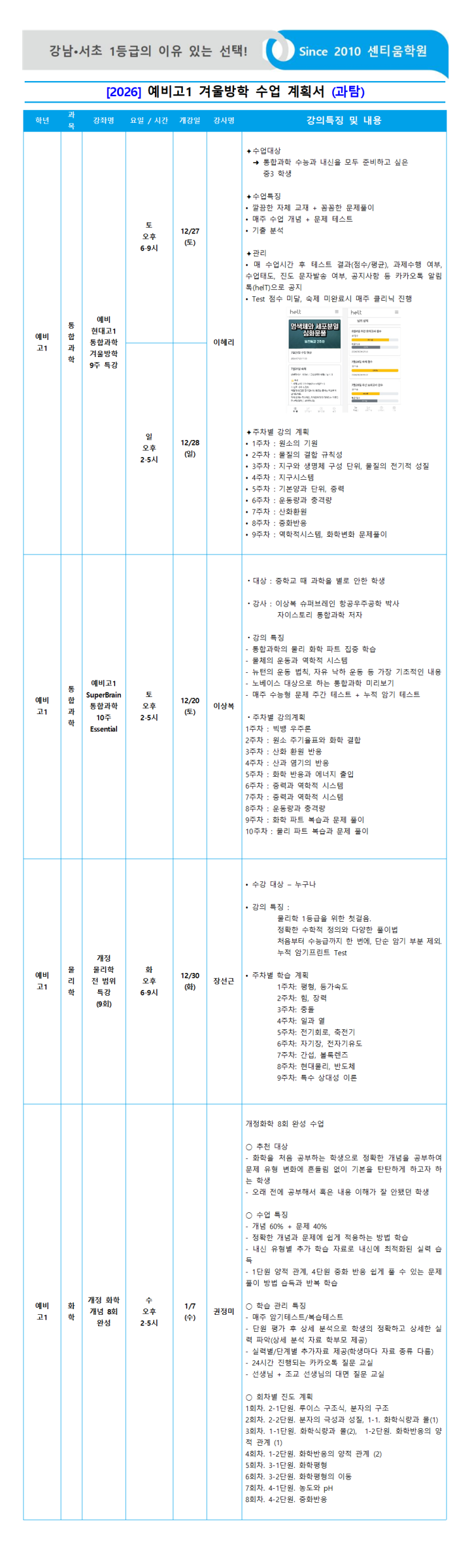 [2026] 예비고1 겨울방학 강의계획서 (과탐)