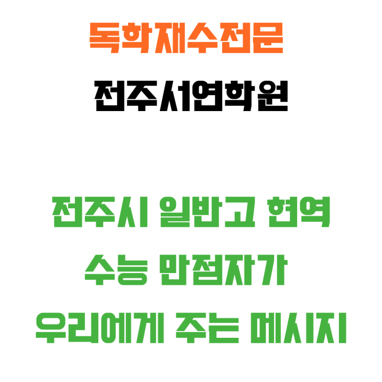 안녕하세요 #전주재수학원 #전주독학재수학원 #전주서연학원 입니다 전주시에서 2018년 이후 처음으로 수능 만점자가 나왔습니다. 전주시 소재 일반고인 한일고등학교 3학년 재학생이 이번 2026 수능에서 만점을 획득했습니다. 전북도민으로서 저도 자부심을 느끼게 해주는 경사로운 일입니다. 수능 만점자 이하진 학생이 우리에게 전해주는 메시지에 대해서 오늘 글을 쓰고자 합니다 굳이 서울에서 공부하지 않아도 수능 만점을 맞을 수 있다 수능 만점자 이하진 학생은 인터뷰에서 수업이나 문제집을 지방에 있으면서도 필요한 만큼 다 얻을 수 있다는 것을 얘기했습니다. 즉, 서울에 굳이 가지 않더라도 수능을 잘 볼 수 있게 필요한 문제집이....... <img src="https://blogthumb.pstatic.net/MjAyNTEyMDVfMTk5/MDAxNzY0OTI3Mjg5MzU1.bsJr58gssaZa2KEu53kkESz00al2EV_ZNw2_ZyX3Z80g.rRKUUHaToLuA8Bp1iRXRDtk22y07zetdTf0-DTp4b2og.PNG/Never_give_up_instagram_post__%2812%29.png?type=s3" />
