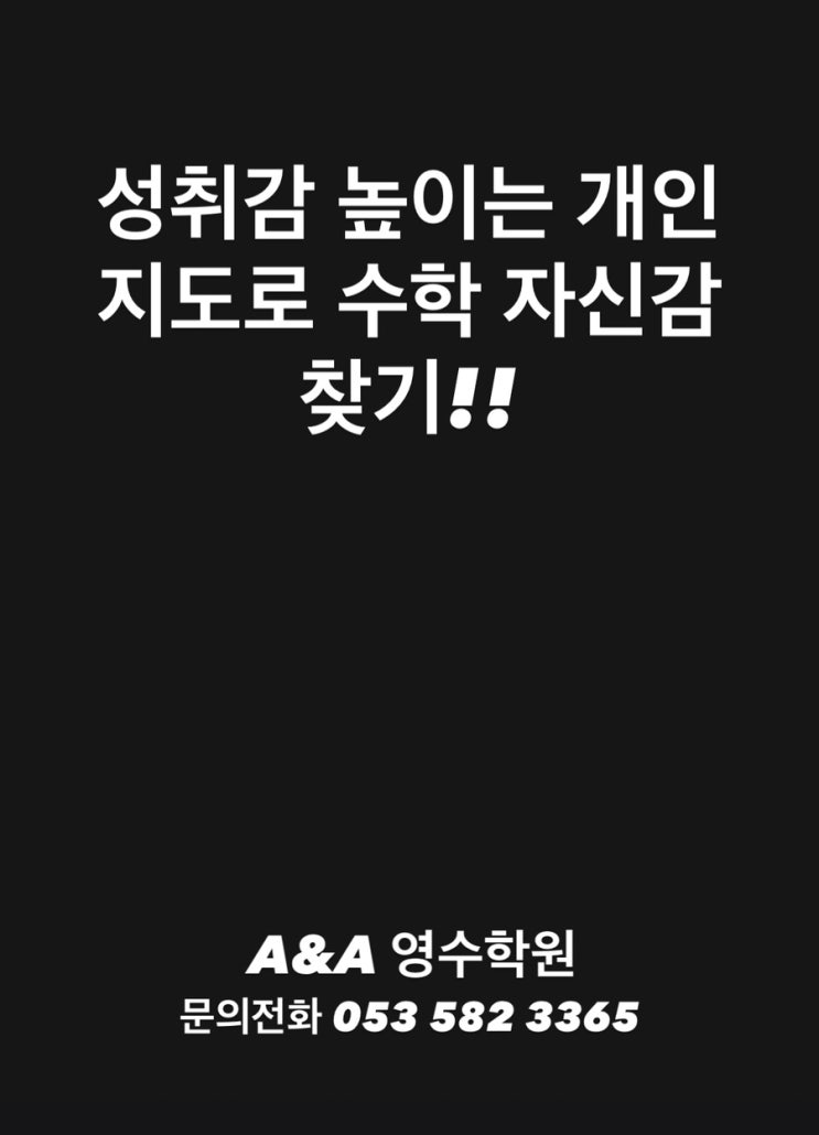 안녕하세요 다사 영어 수학 전문학원 A&A 영수학원입니다. 성취감 높이는 개인 지도로 수학 자신감 찾기!! 많은 학부모님들이 4학년 이상이 되어서야 우리 아이가 수학이 좀 부족한가 하시죠? 학교 단원 평가도 오답이 늘기 시작하면서 학습 구멍이 실감 나기 시작합니다. 실제로 초등 수학 교과과정은 초등 저학년까지는 많은 학습량 없이도 그 나이의 사고 수준으로 충분히 이해가 가능한 학습입니다. 하지만 고학년 수학은 아니죠 무방비 상태로 있다 어영부영 중학교로 가서 내신이라는 평가시험을 치르면 그때 학생들의 학습 상실감은 사춘기와 함께 공부를 멀리하게 하는 촉진제가 될 뿐입니다. 벽돌 쌓기와 같은 수학, 초등부터 차곡....... <img src="https://blogthumb.pstatic.net/MjAyNTExMjFfMTE0/MDAxNzYzNjk1MTQ0MjYy.VurjFUCsFg8rphk9nQEzeruDZayBKse6ArPRCgHSU4sg.M8JmFnO3vbTPNPnlKsYQnHCv8qGxWcvMgeqaKwzBDX0g.JPEG/IMG%A3%DF8965.jpg?type=s3" />