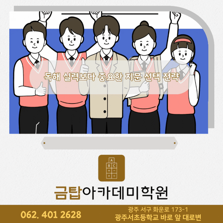 안녕하세요. 화정동 영어학원 금탑아카데미학원입니다. 매년 고2와 고3 학생들을 지도하다 보면 겨울 시기에 독해 실력 자체보다 지문을 선택하는 전략이 성적에 더 큰 영향을 미치는 모습을 자주 확인하게 됩니다. 지문을 어떤 순서로 풀어야 하는지, 어떤 기준으로 먼저 접근해야 하는지가 정해져 있지 않으면 실력이 있어도 점수가 흔들릴 수 있습니다. 이 시기에 지문 선택 전략을 점검하는 것만으로도 모의고사와 내신에서 안정적인 흐름을 만들 수 있습니다. [지문 선택이 성적을 바꾸는 이유] 모의고사와 내신 시험은 시간이라는 제한 속에서 최대한 정확하게 문제를 해결해야 하는 구조입니다. 독해 능력이 높아도 지문을 무리한 순서로....... <img src="https://blogthumb.pstatic.net/MjAyNTEyMTFfMjk3/MDAxNzY1MzgwNjE4Mzg5.5r80HhTEsRv10k9-4UlW2h9uy_lZ-iOpCUSBrCzDB3Ag.eFSNNOPHxZqcXXHs6JPMRfumf9Mq_XFdbyZvC5s0jWcg.GIF/%A1%DA%A1%DA%B1%DD%C5%BE%BE%C6%C4%AB%B5%A5%B9%CC.gif?type=s3" />