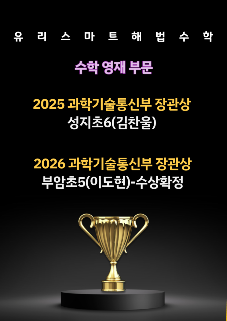 규모는 작아도 실력은 압도적! 유리스마트해법수학 학원에서 수학 영재 부문 장관상 수상자 2명이 배출되었습니다. 일반적으로 수학 영재원 대비는 두가지 학원을 병행하거나 두배의 비용을 치르며 준비합니다. 대부분 학원이 교과(선행)과 창의사고 수학을 별개의 수업으로 보기 때문이죠. 그것이 잘못된 것이 아니라 그만큼 다루는 영역이 다르기 때문입니다. 유리스마트해법수학은 수학전공 원장의 15년간의 대형학원(대성학원, 생각하는수학원 등)에서의 고등 입시 수업 경력과 수년간의 와이즈만 영재 팀장 경험을 바탕으로 의도치 않게(?) 한 곳에서 끝내는 수업이 제공 되고 있습니다. ^^ 순수한 개인적 흥미와 노하우로 진행하는 창의 수....... <img src="https://blogthumb.pstatic.net/MjAyNTExMTVfMjQ4/MDAxNzYzMTcxNTI1OTc0.QVVObeDedHCLpWuC2k3KS29R06_hSGMNaEOw1CaYNocg.oQvvIyQk1n2Hfz9WuM7V3hSkgCJKt1sr8f5Tx3jDPM4g.PNG/%C1%A6%B8%F1%C0%BB-%C0%D4%B7%C2%C7%D8%C1%D6%BC%BC%BF%E4_-001_%2827%29.png?type=s3" />