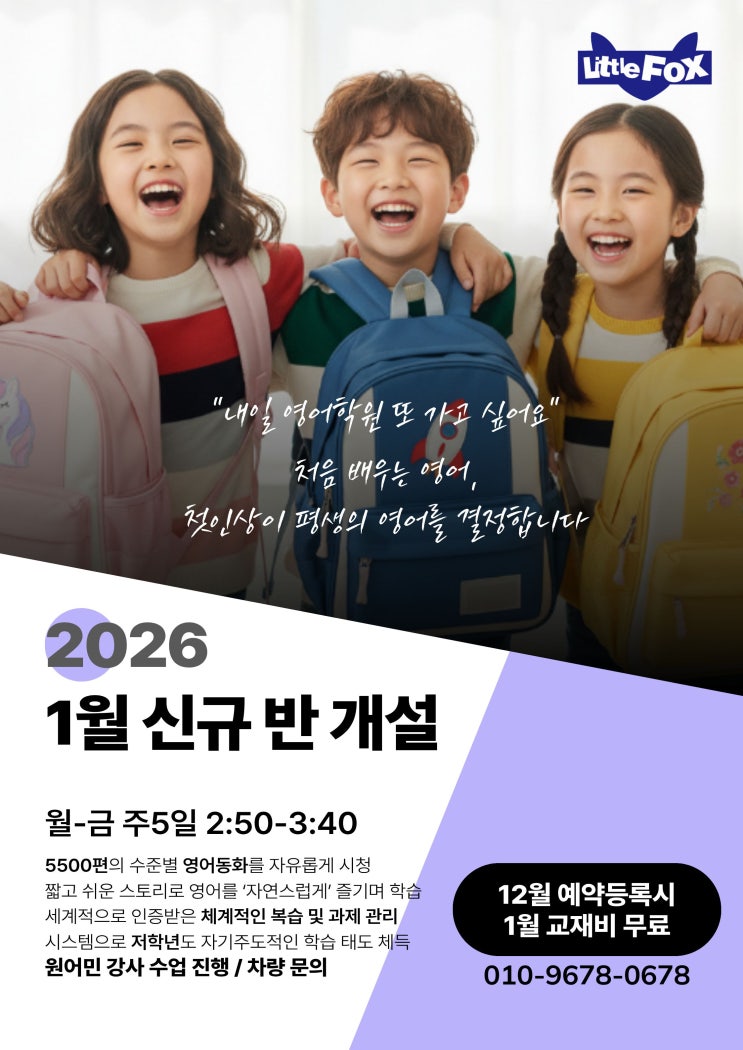 신창동 영어학원 "내일 영어학원 또 가고 싶어요"영어 첫인상을 결정하는 리틀팍스어학원 2026년 1월 신규반 모집