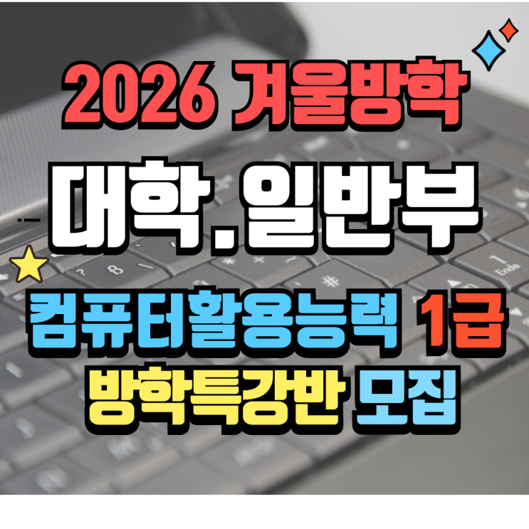 ◆ 2026년 겨울방학 컴퓨터활용능력 1급(2급포함) 단기방학특강반 개강◆ (2026년 1월부(3주)와 2월부(3주) 각각 모집합니다) <<2026년 1월부>> [ 2026년 1월 컴퓨터활용능력 1급 단기속성(3주) 특강반] ▶ 개 강 일 : 2026. 1. 12(월) ▶ 수업기간 : 2026. 1. 12(월) ~ 1월 30(금) 3주과정(토,일제외) ▶ 과 목 : 컴퓨터활용능력 1급 필기, 실기 ▶ 시 간 : 월~금 오후 1:00 ~ 3:00(일 2시간씩 총 15회) <<2026년 2월부>> [ 2026년 2월 컴퓨터활용능력 1급 단기속성(3주) 특강반] ▶ 개 강 일 : 2026. 2. 2(월) ▶ 수업기간 : 2026. 2. 2(월) ~ 2월 21(토) 3주과정(토요일 포함, 일요일과 설연휴 제외) ▶ 과 목 : 컴퓨....... <img src="https://blogthumb.pstatic.net/MjAyNTExMDhfMTgx/MDAxNzYyNjA1ODc4NzYw.YLBt9iW-IBJtHSOPcjD5L_HJtJeD-B_6TV42PNWJLrcg.yVQB9zSI1SlfGrYKOTwuFfQsznxC7fX5LjwS8UehNW4g.PNG/대학일반부_방학특강.png?type=s3" />
