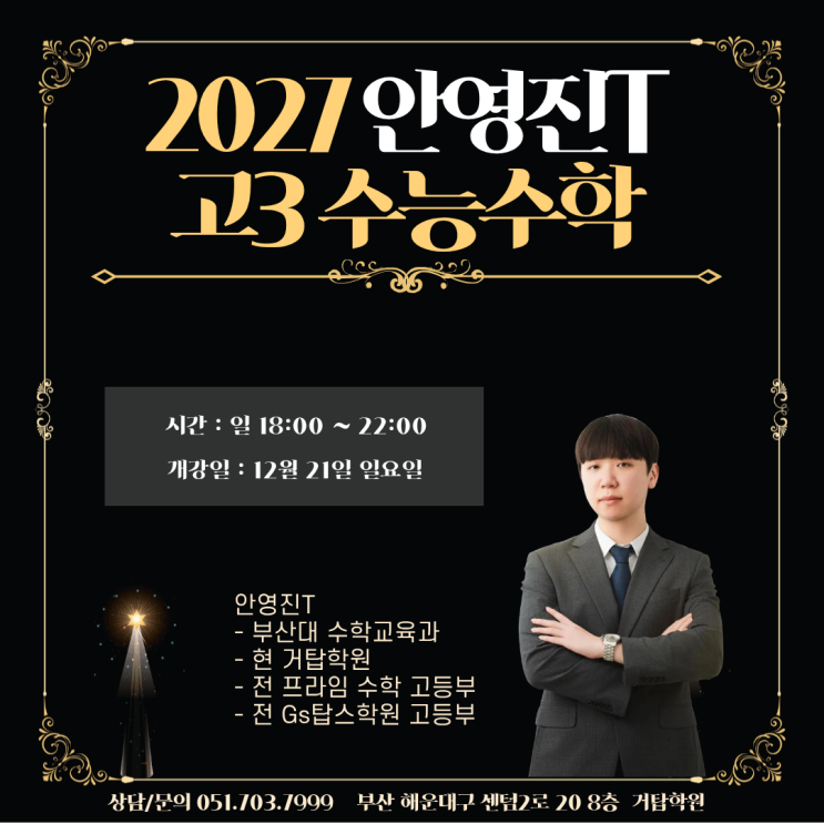 안녕하세요, 거탑학원입니다. 2027학년도 수능을 대비한 고3 수능수학 정규반 안내드립니다. -수업일정 : 12월 21일 (일) 개강 -수업시간 : 일요일 18:00~22:00 -수업구성 : 1시간 미니 모의고사 + 3시간 수업 진행 수능 최상위권을 목표로 설계된 정규반으로 모든 수업은 “평가원 기준”과 “실전력 강화”에 맞춰 진행됩니다. 자세한 커리큘럼은 포스터를 참고해주세요. 안영진T - 부산대 수학교육과 - 현 거탑학원 - 전 프라임 수학 고등부 - 전 Gs탑스학원 고등부 수강 신청 및 문의 사항은 학원으로 연락해주시면 안내 드리겠습니다. 전화: 051-703-7999 문자: 010-9081-7037 <img src="https://blogthumb.pstatic.net/MjAyNTExMTZfMjAz/MDAxNzYzMjk0MDczODgw.nAya3Qp_QMyeo_haUA7HOfEX1eekTvLcOzhfs2rf63Mg.thqwHtoDH9iktPwa4lxHrlZr9hQtuy0ZIDTsRRSUGkwg.PNG/%BC%F6%B4%C91.png?type=s3" />