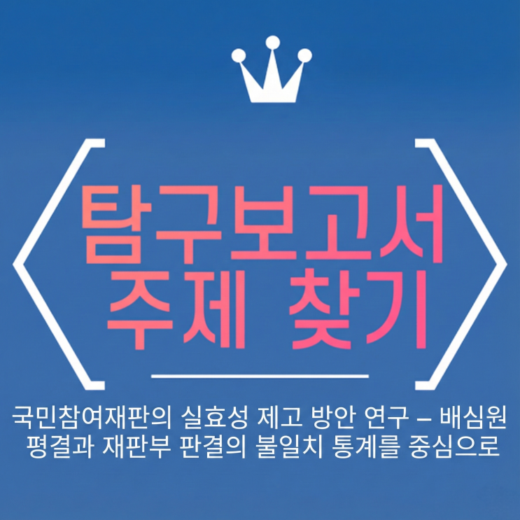 국민참여재판의 실효성 제고 방안 연구 – 배심원 평결과 재판부 판결의 불일치 통계를 중심으로 작성자: ○○고등학교 ○학년 ○반 김○○ 목차 주제 선정의 이유 본론 1: 국민참여재판의 현황과 효력의 한계 본론 2: 불일치 발생의 원인 – 법리적 판단 vs 법 감정 본론 3: 제도의 실효성 확보를 위한 개선 방안 결론 참고문헌 1. 주제 선정의 이유 사법의 민주적 정당성을 확보하기 위해 도입된 국민참여재판 제도가 시행된 지 10년이 넘었다. 하지만 최근 뉴스나 판례를 보면 배심원들이 만장일치로 무죄를 평결했음에도 재판부가 이를 뒤집고 유죄를 선고하거나, 반대로 배심원의 엄벌 요구가 판결에 반영되지 않는 사례가 종종 발생한....... <img src="https://blogthumb.pstatic.net/MjAyNTEyMTBfMjQ4/MDAxNzY1MzU5NDQ2MDQy.7JRaxlVBvp4G1DpabKeJJZlibaNxxYgkqXB7Xg2hJLkg.bIeLHgAsu9oR4Of63g3nmYu3ss3PwgXEaPTASSN2wMIg.PNG/KakaoTalk_20251210_175351181.png?type=s3" />
