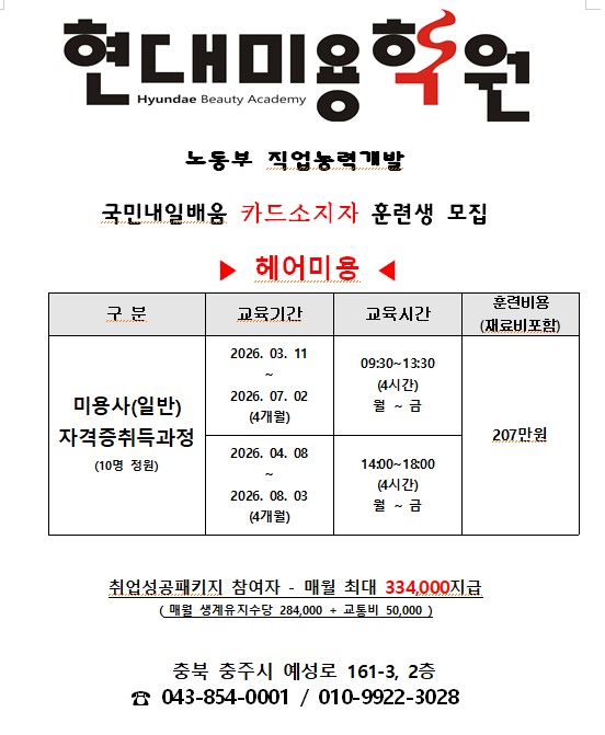 #미용국비 #충주국비학원 #충주미용학원 #미용국비학원 #국비학원 #미용인턴 #헤어디자이너 #미용강사 #미용실창업 #미용실취업 #미용자격증 #미용실 #헤어자격증 #피부자격증 #네일아트 #메이크업 #이용사시험 충주 유일한 미용국비 교육기관 현대미용학원 충주에 유일하게 국가지원 미용훈련을 실시 중인 현대미용학원입니다. 점점 국비지원하는 훈련기관이 취업률로 인해 축소되고 있는 지금. 꾸준한 취업지원과 체계적인 NCS미용 기반 훈련으로 까다로운 노동부의 기준에도 20년간 국비훈련을 하고 있는 현대미용학원 입니다. 매년 훈련에 대한 평가를 받고 까다로운 기준을 통과해야만 훈련을 지속적으로 실시할 수가 있습니다. 미용전문가....... <img src="https://blogthumb.pstatic.net/MjAyNTEyMDNfNzEg/MDAxNzY0NzMzOTkzOTE3.8eRjuZFdWORxyjWWVo9wlsdzCSf-LIiA9w8R6MmVJscg.D7wAEuA5aTCZIfzTj31EiHWZs_ikr4aN6XEyg1xgbFYg.JPEG/2026%B3%E2_%B1%B9%BA%F1%C0%CF%C1%A4%28%BB%F3%B9%DD%B1%E2%29.jpg?type=s3" />