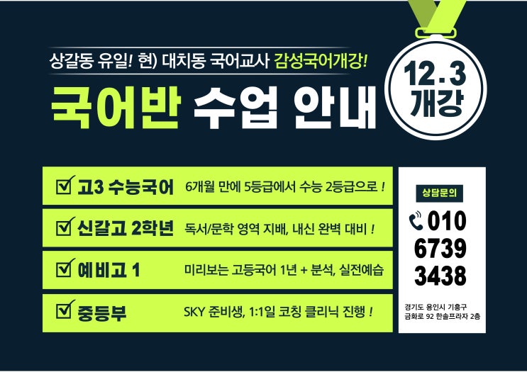 안녕하세요. 감성입시전문학원입니다. 바람이 차가워 손발이 시려운 요즘 건강하신지요? 상갈중 2학년 같은 경우는 시험이 남아 있고 신갈고등학교는 시험중에 있고 생기부도 마무리하며 25년도 마무리 되어갑니다. 겨울 방학의 시작에 맞추어 감성입시전문학원에서는 국어, 영어, 수학을 전문적으로 다루는 선생님들의 겨울 특강이 이루어집니다. 영어경력 25년차 원장쌤 / 현) 대치동 국어강사쌤 / 연세대 출신 다경력 수학쌤 어마무시한 라인업의 선생님들이 각 과목을 맡아 겨울방학동안 열심히 달릴 수 밖에 없는 ...!!!! 그러한 겨울특강 과목들과 커리큘럼을 반영한 특강을 개설하였습니다. 모든 부모님들의 관심사인 우리 아이들의 성적....... <img src="https://blogthumb.pstatic.net/MjAyNTEyMDhfMTU3/MDAxNzY1MTk1MDg4NzAw.7PNqZPgygL6zDPX_DcbzisARZqQIwTdRRrMd7nwvCCYg.zW_3iLc_8KHdPQEk1qWBfx9my-kd178BnSWORGTXRiAg.JPEG/%C1%A6%B8%F1%C0%BB_%C0%D4%B7%C2%C7%D8%C1%D6%BC%BC%BF%E4..jpg?type=s3" />