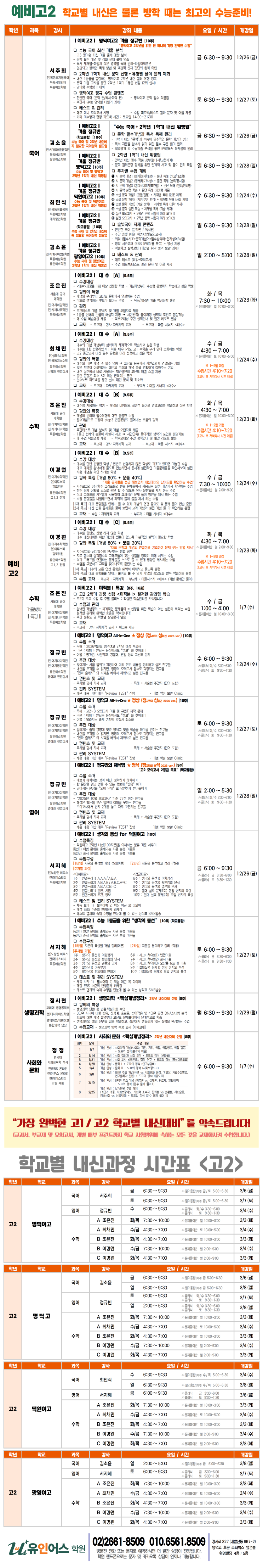 <예비고2> 겨울방학 시간표 2026 유인어스학원 (강서 발산 수능 내신) 명덕여고 명덕고 덕원여고 광영여고