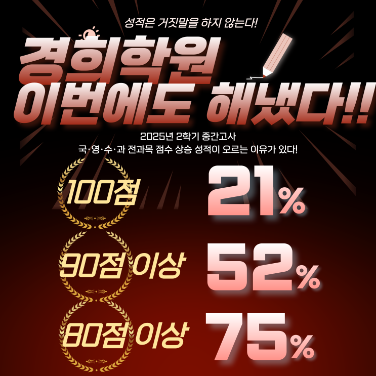 안녕하세요~ 경희학원입니다. 학기가 한창 진행되는 지금, 여러분의 노력이 결실을 맺는 중요한 시기인 기말고사사가 다가오고 있습니다. 이번 포스팅에서는 중간고사 결과 발표와 함께 학생들에게 의지를 불태우는 메시지를 전하고자 합니다. 이번 중간고사에서 우리 학원 학생들은 정말 멋진 성과를 거두었습니다. 통계적으로 보면, 21%의 학생들이 100점을 기록하였고, 52%는 90점 이상, 75%는 80점 이상의 성적을 받았습니다. 이러한 결과는 학생들의 꾸준한 노력과 선생님들의 헌신 덕분입니다. 학생 여러분, 여러분의 노력은 결코 헛되지 않았습니다. 중간고사를 준비하는 과정에서 여러분은 많은 것을 배웠고, 성장했습니다. 꾸준한 학습....... <img src="https://blogthumb.pstatic.net/MjAyNTExMTdfMjIw/MDAxNzYzMzYxNDYxOTQ2.Zc69Av3Jfwp2gXPTrmTHqChdV3qbFocPqpBhnVrVkIgg.EIDaGdxx6F0zmXi7U3SszTiRKAeRC-nDtEXkGyby9lQg.PNG/%C1%A6%B8%F1%C0%BB_%C0%D4%B7%C2%C7%D8%C1%D6%BC%BC%BF%E4._%283%29.png?type=s3" />